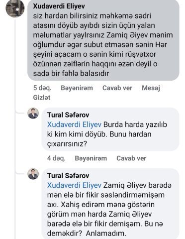 Naxçıvan Muxtar Respublikasının Babək Rayon Məhkəməsinin sədri Zamiq Əliyevin atası Xudaverdi Əliyev sosial şəbəkə hesabı üzərindən “TNS” İnformasiya Agentliyinin direktoru, tanınmış jurnalist Tural Səfərovu təhqir edib və ona böhtan atıb.