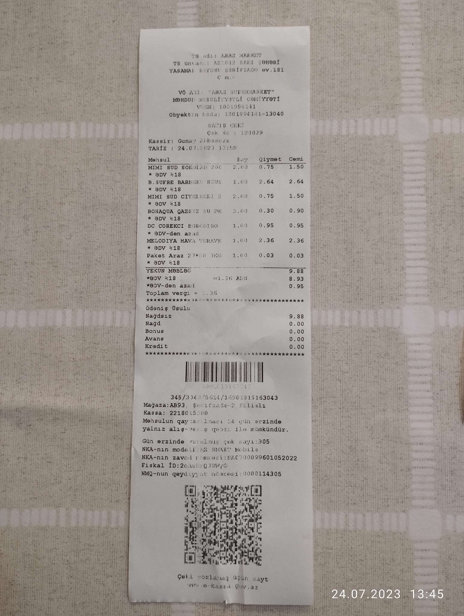 "Müştərinin Səsi" sosial qrupundakı paylaşımında Mayiz Nağıyev adlı istifadəçi yazır: "`Araz` Supermarketinin İnşaatçılar filialına xitab edirəm. Təqdim etdiyiniz kassa çekiniz bu vəziyyətdədir.
