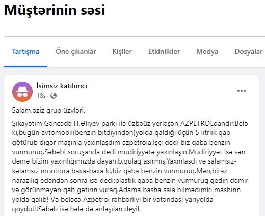 Şikayətim Gəncədə H.Əliyev parkı ilə üzbəüz yerləşən "AZPETROL"dandır. Belə ki, bugün avtomobilim (benzin bitdiyindən) yolda qaldığı üçün 5 litrlik qab götürub digər maşınla yaxınlaşdım "Azpetrol"a. İşçi dedi biz qaba benzin vurmuruq. Səbəbi soruşanda dedi müdiriyyətə yaxınlaşın.
