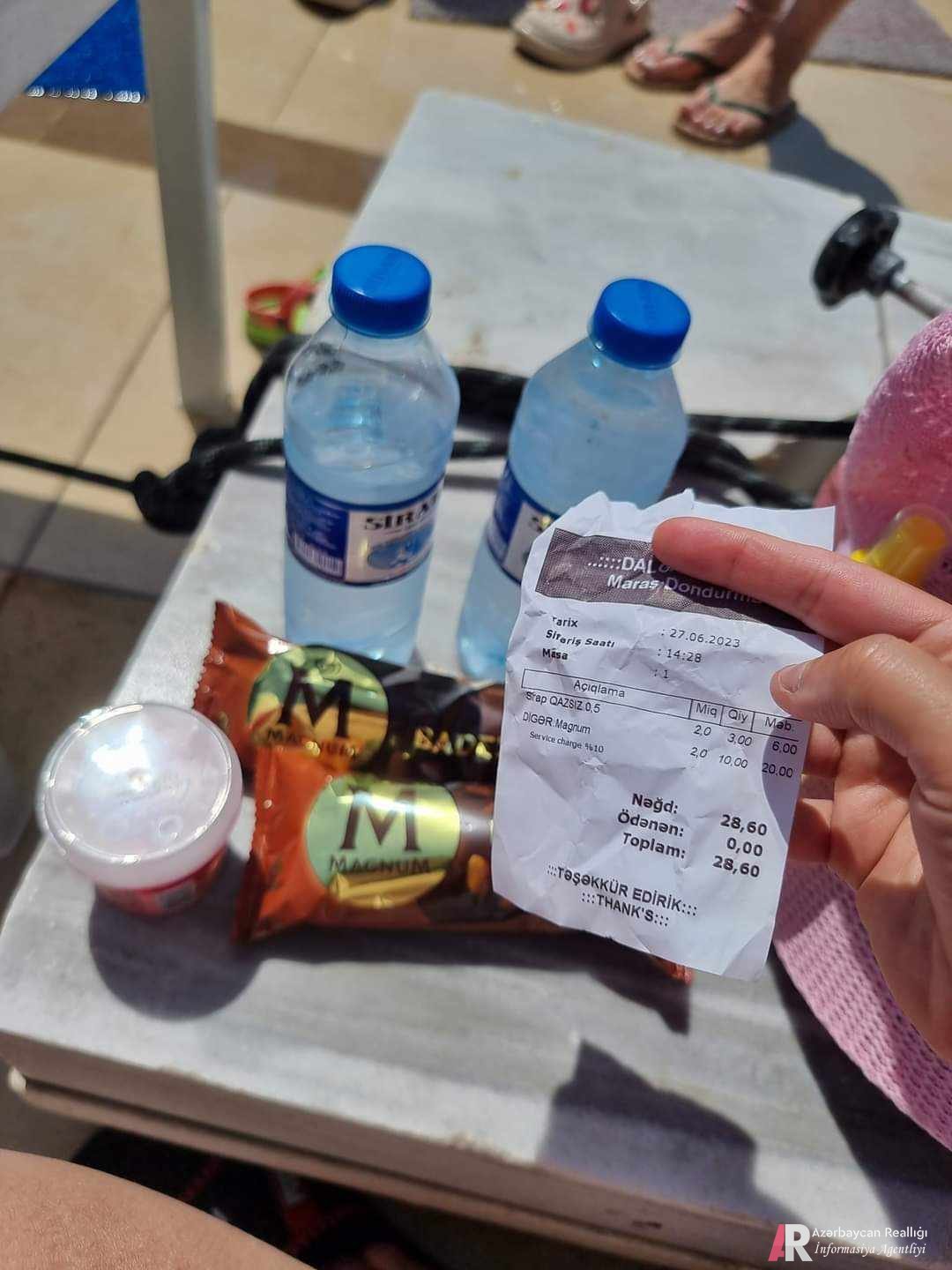 Nəhayət zorla bir yer tapdıq. Şəkildə 2 dənə yarım litr su və 3 marojnaya 28.60 qəpik aldılar...