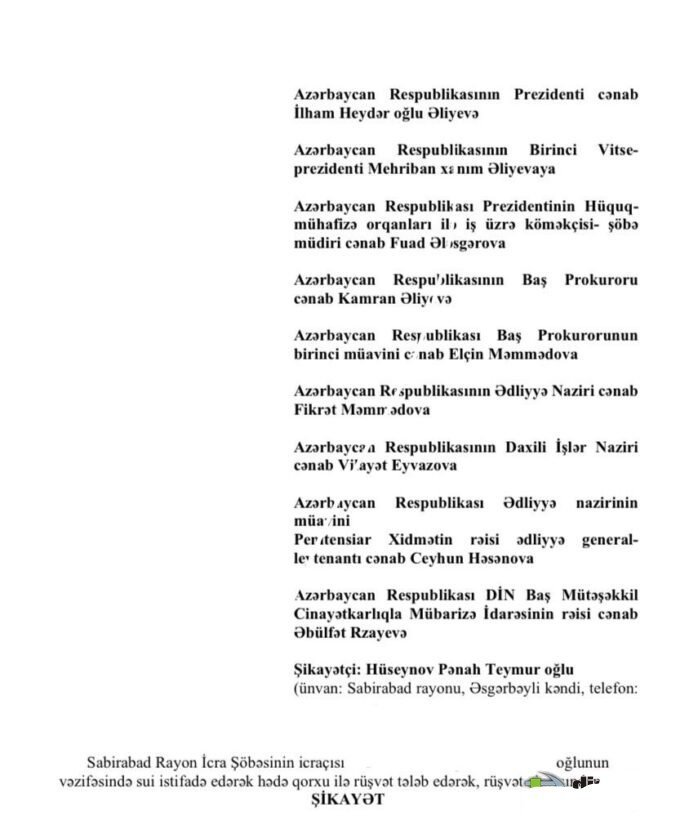 Onun sözlərinə görə, şikayət məktubunun surətini paralel olaraq, prezident, birinci vitse-prezident, ədliyyə naziri, daxili işlər naziri və başqa qurumlara da ünvanlayıb. Bu qurumlardan da hələlik səs-soraq gəlməyib: