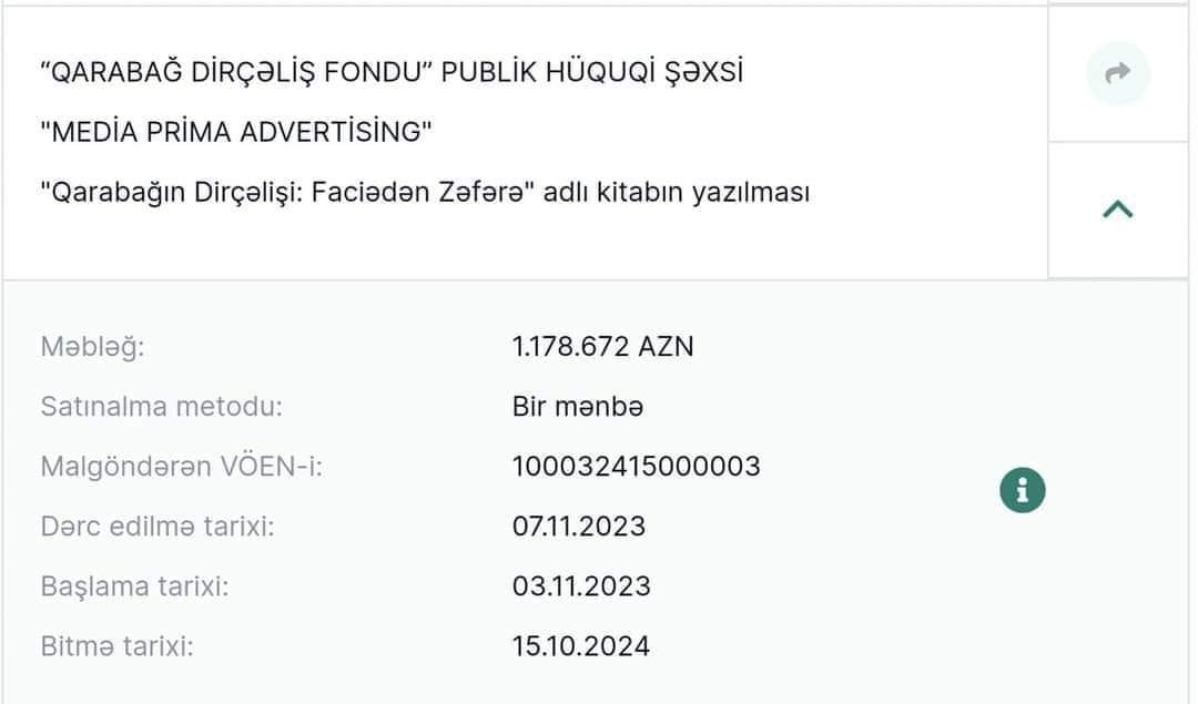“Qarabağın Dirçəlişi: Faciədən Zəfərə” adlı kitabın yazılması üçün 1 178 672 manatlıq müqavilə imzalanıb.