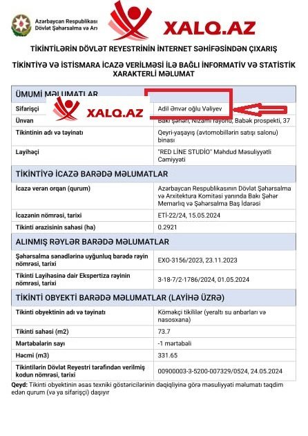 XALQ.AZ-ın məlumatına görə, Dövlət Şəhərsalma və Arxitektura Komitəsinin rəsmi saytında, Bakı şəhəri Nizami rayonu, Babək prospekti, 37 ünvanında tikinti sahəsi 1026 kvadrat, 2 mərtəbli zirzəmili, olan obyekt Adil Ənvər oğlu Vəliyevin adına sənədləşdirilib. “RED LİNE STUDİO” MMC-nin lahiyəçisi olduğu qeyri-yaşayış (avtomobillərin satışı salonu) binası kimi rəsmiləşmə 15.05.2024-cü ildə Azərbaycan Respublikasının Dövlət Şəhərsalma və Arxitektura Komitəsi yanında Bakı Şəhər Memarlıq və Şəhərsalma Baş İdarəsi tərəfindən təsdiq olunub. 24.05.2024-ci tarixində Tikintilərin Dövlət Reyestri tərəfində qeydiyyata alınıb.