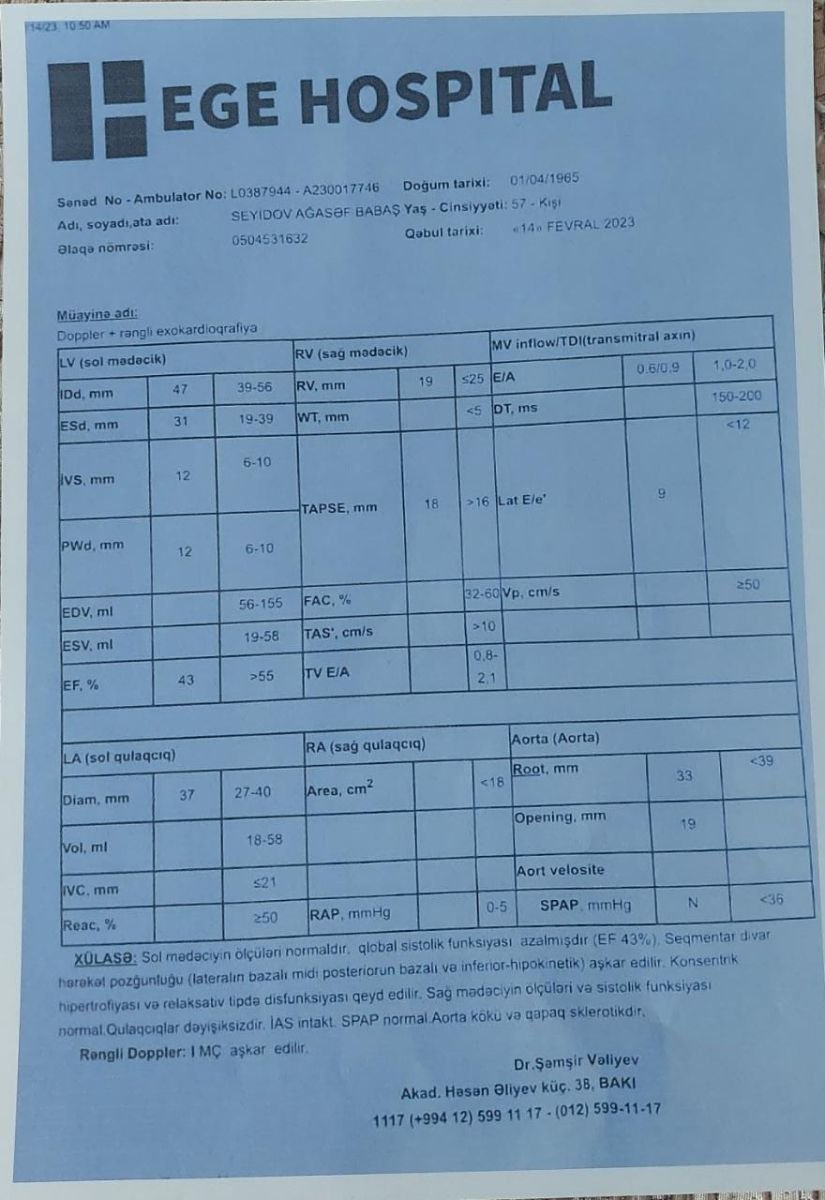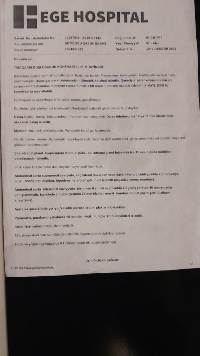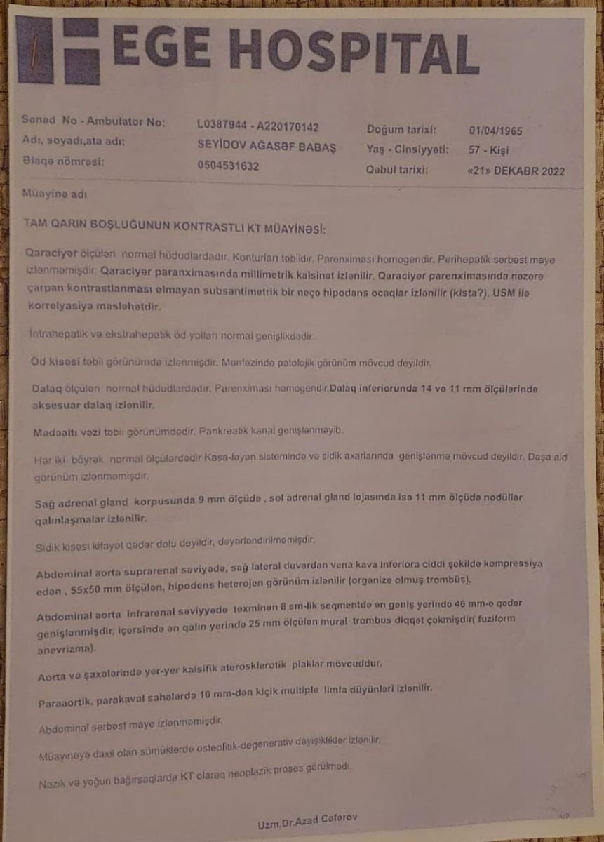 Qeyd edim ki, “Ege Hospital”ın həkimləri atamın əməliyyat olduğu xəstəliyi tam fərqli göstərərək, onu sığortalı kimi yazıb dövləti də, bizi də aldadıblar. Atamın xəstəliyi kəskin “Aorta anevrizma” (damar partlaması) xəstəliyidir. Ürək xəstəxanası və “Ege Hospital”ın həkimləri əlbir olub, bizim başımıza bu oyunu açıblar. Dəfələrlə Azərbaycan Respublikasının Baş Prokurorluğuna bununla bağlı müraciətlər etsək də, heç bir tədbir görülməyib. Atamın da vəziyyəti günü-gündən pisləşir. Hər gün evimizə təcili yardım gəlir.