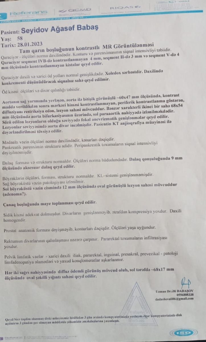 Deməli, bu həkimlər kimlərəsə arxayındır ki, MRT (maqnit-rezonans tomoqrafiyası və ya nüvə-maqnit-rezonansı tomoqrafiyasının) aparat həkimini də öz saxtakarlıqlarına tabe edib, sənədləri dəyişiblər. Hər bir sübutlar məndə var. Necə rüşvət almaları ilə bağlı video çəkilişi və sənədlər barəsində olan subutları sizə təqdim edəcəm. Məni məcburi olaraq bu həddə çatdırıblar. Köhnə sənədləri onlara verən zaman geri qaytarmadılar. Çünki həmin sənəddə diaqnoz tamamilə başqa xəstəlik idi. Atam dövlətin sığortası ilə əməliyyat olunubsa, niyə məndən 15 min manat pul alıblar?