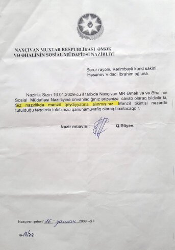 QAZİ kimi mənzil qeydiyyatına alınmam üçün 2008-ci ildə müvafiq sənədləri toplayaraq Naxçıvan MR Əmək və Əhalinin Sosial Müdafiəsi Nazirliyinə təqdim etdim və oradan da mənə Nazir müavini Qadir Əliyevin imzası ilə mənzil qeydiyyatına alınmam barədə müvafiq cavab verildi.Sonrakı illər də növbəm ilə maraqlananda mənə başdan sovdu cavablar verilirdi...Şikayət etdim əvəzində oğlumun işdən çıxarılması ilə təhdid etdilər və məni dövlətimuzə və dövlətçiliyimizə qarşı narahat adam kimi tanıtmağa başladılar. HALBU Kİ, MƏN BU DÖVLƏT VƏ MİLLƏT ÜÇÜN 1990-cı ilə qədər qulluq etdiyim Rusiyada bütün şəraitimi,o cümlədən xidməti karyeramı ataraq vətənin müdafiəsinə gəldim və bu yolda vuruşaraq Qazi oldum.Ən nəhayət oğlumu işlədiyi Sədərək rayon İcra Hakimiyyətində heç bir səbəb olmadan işdən çıxardılar...Son zamanlar məlum oldu ki, Naxçıvan MR ƏƏSM Nazirliyində mənim qeydiyyatım olmayıb və yoxdur.Onlar mənə yenidən mənzil qeydiyyatına alınmam üçün Şərur rayon İH müraciət etməmi tövsiyə etdilər...Sağ olsunlar Şərur rayon İcra Hakimiyyətinin şöbə müdiri Ceyhun müəllim və müvafiq əməkdaşları müraciətimə operativ olaraq baxıldılar. Şərur rayon İcra Hakimiyyəti Başçısının müvafiq sərəncamı verilərək mənzil qeydiyyatına alınmam üçün sənədlər yenidən NAXÇIVAN MR ƏƏSM Nazirliyinə göndərildi... Məni incidən bax bu 15 ilin haqsızlığıdır.Oğlumun haqsız olaraq işdən çıxarılmasıdır...İndi mən bir 15 ildə gözləməliyəm ki, mənzil ala biləm. Amma bunlar unudurlar ki, bu gün mənim 66 yaşım var və nəinki,15 il heç 15 gün belə yaşamağa ümid yoxdur...