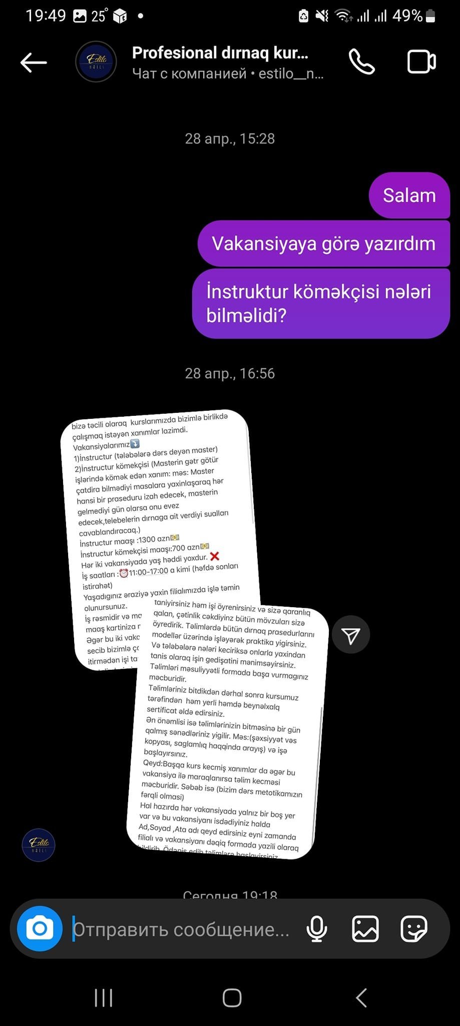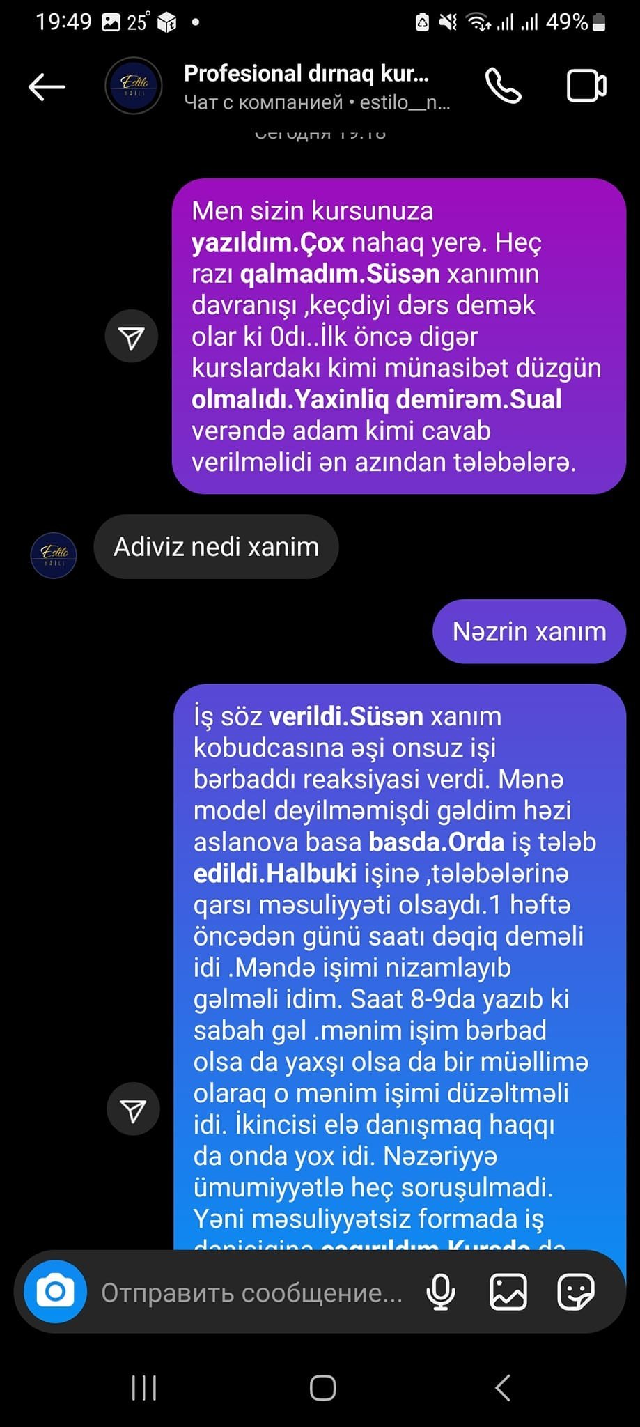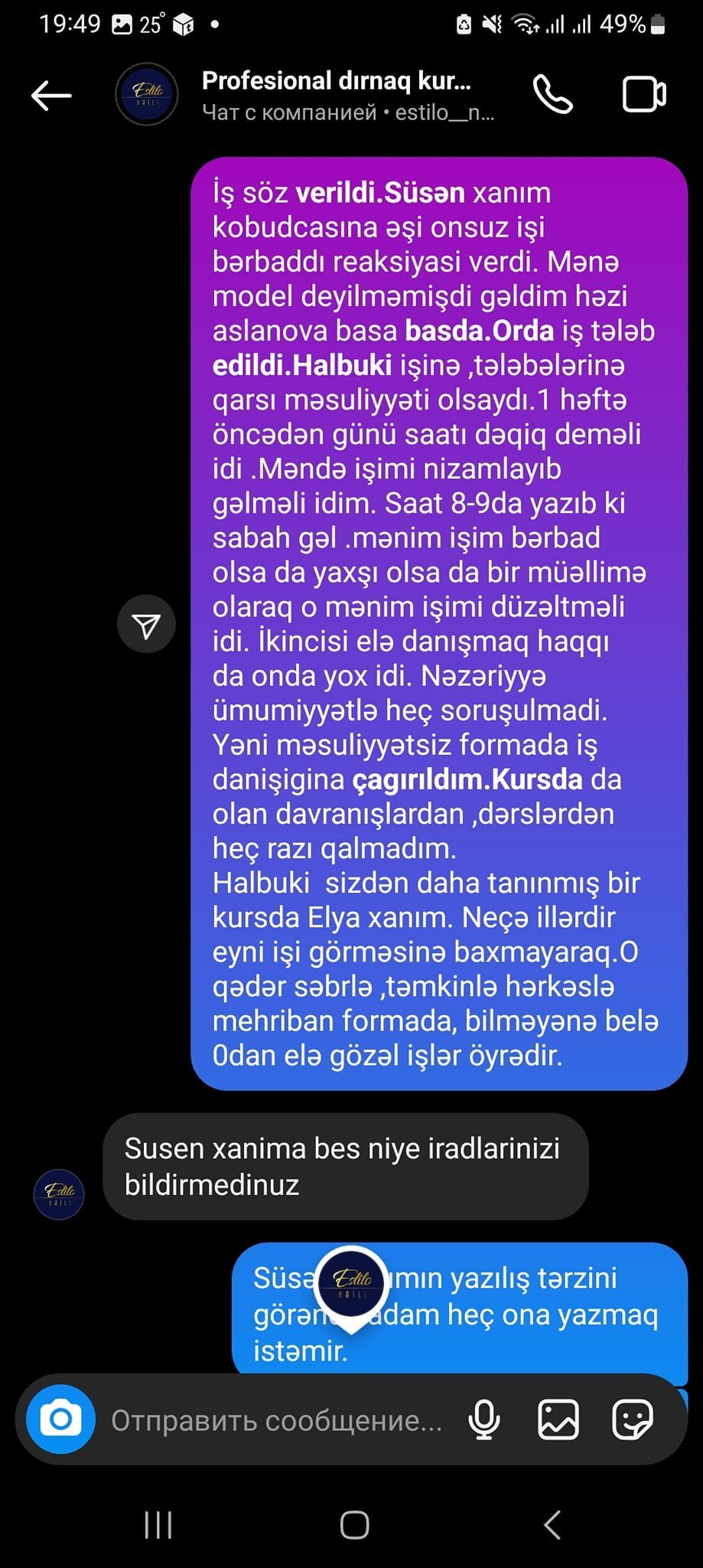 Narazı vətəndaş daha sonra yazır: "Bu dırnaq kursu bütün hamıya vakansiya təklif edir yüksək maaşla ( Vakansiyalar isə İnstruktor və İnstruktor köməkçisidir. ) və işə başlamaq üçün mütləq kursu bitirmək lazımdır ki, o proqramla dərs keçəsən. Kurs isə ödənişlidir ( 250₼ ). Bizə tapşırıldı ki, orada heçkəsə iş üçün gəldiyimizi deməyin. Əsas məsələdə bundan sonra başlayır.