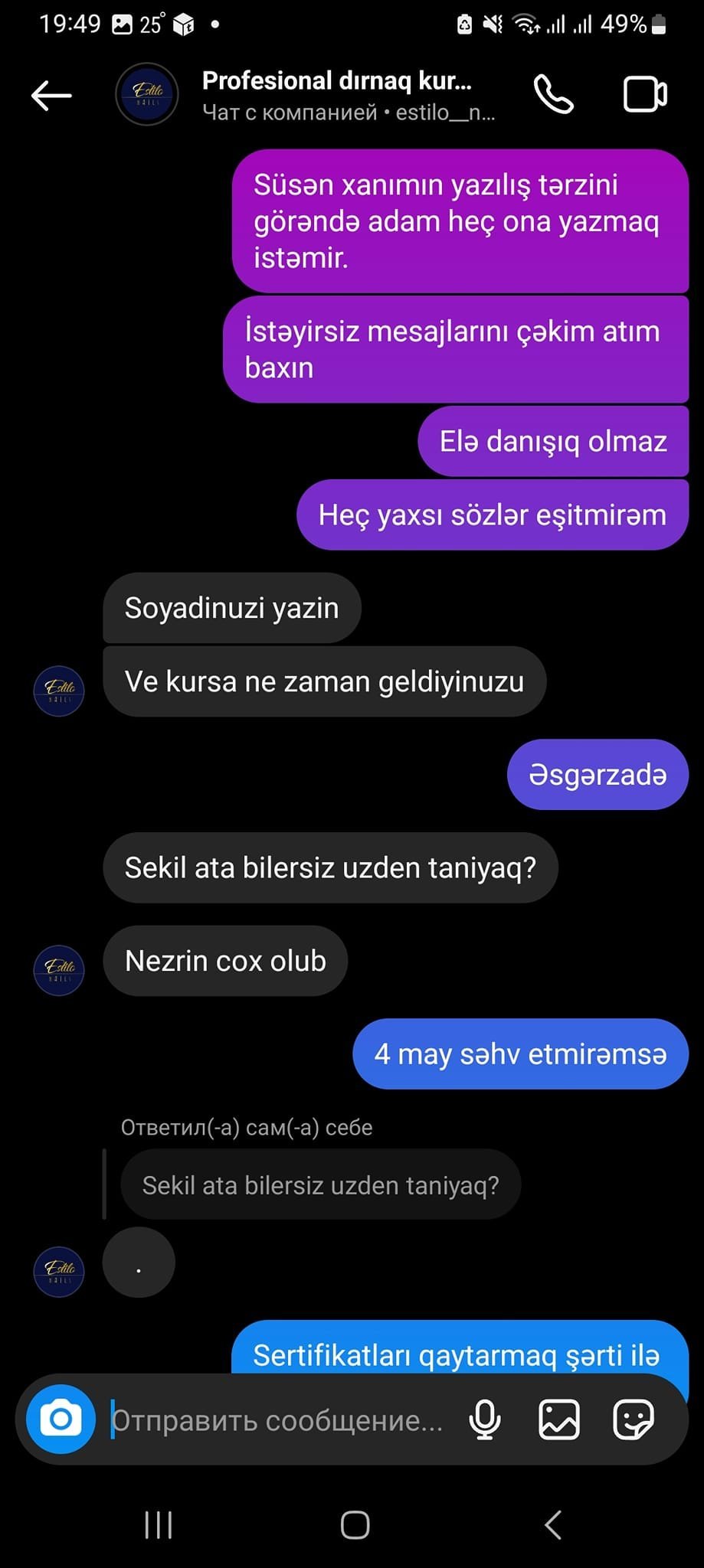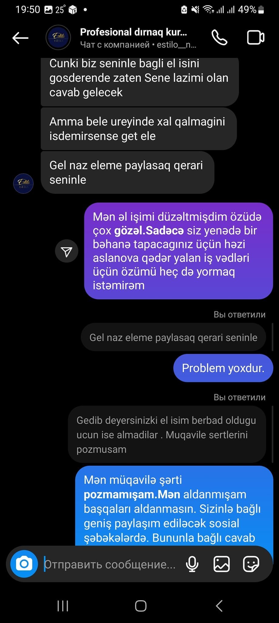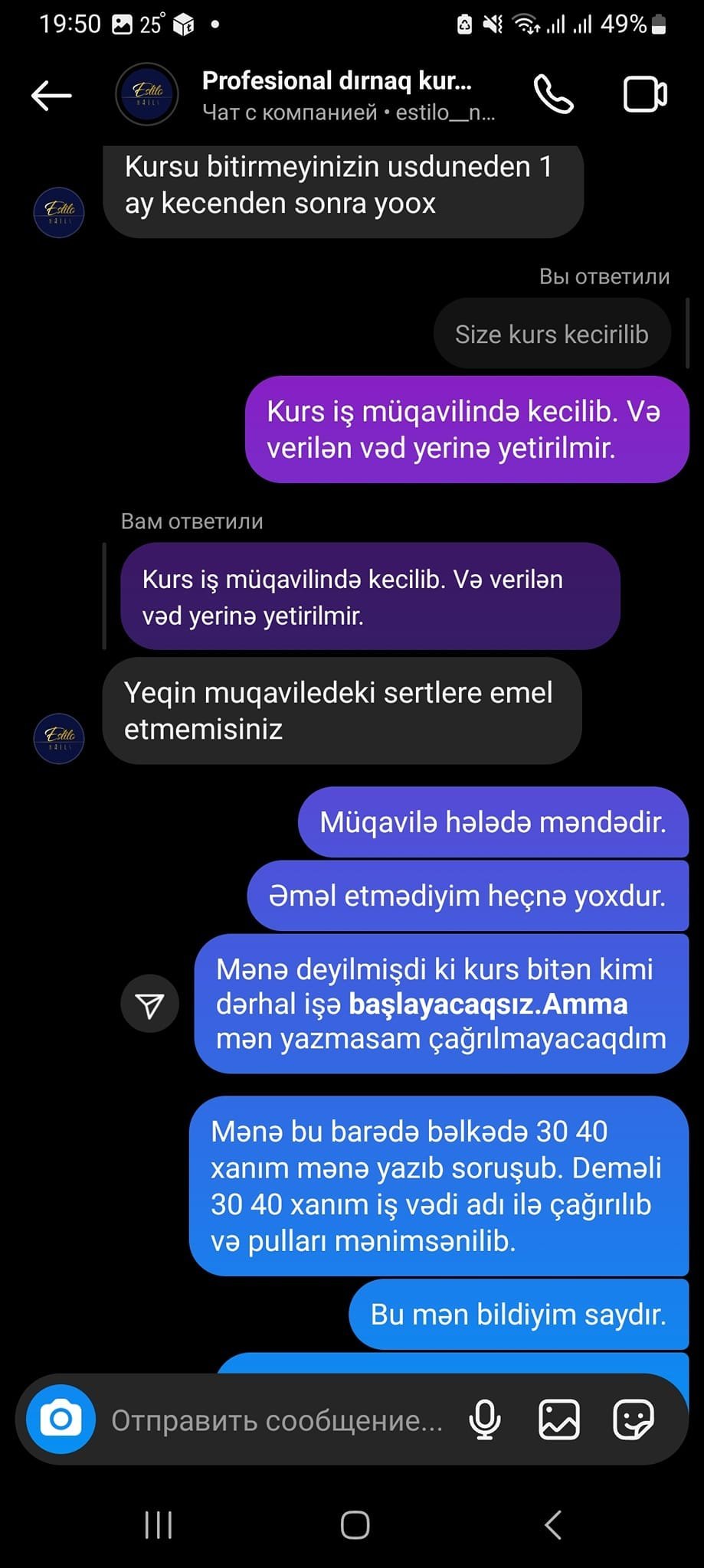 Narazı vətəndaş daha sonra yazır: "Bu dırnaq kursu bütün hamıya vakansiya təklif edir yüksək maaşla ( Vakansiyalar isə İnstruktor və İnstruktor köməkçisidir. ) və işə başlamaq üçün mütləq kursu bitirmək lazımdır ki, o proqramla dərs keçəsən. Kurs isə ödənişlidir ( 250₼ ). Bizə tapşırıldı ki, orada heçkəsə iş üçün gəldiyimizi deməyin. Əsas məsələdə bundan sonra başlayır.