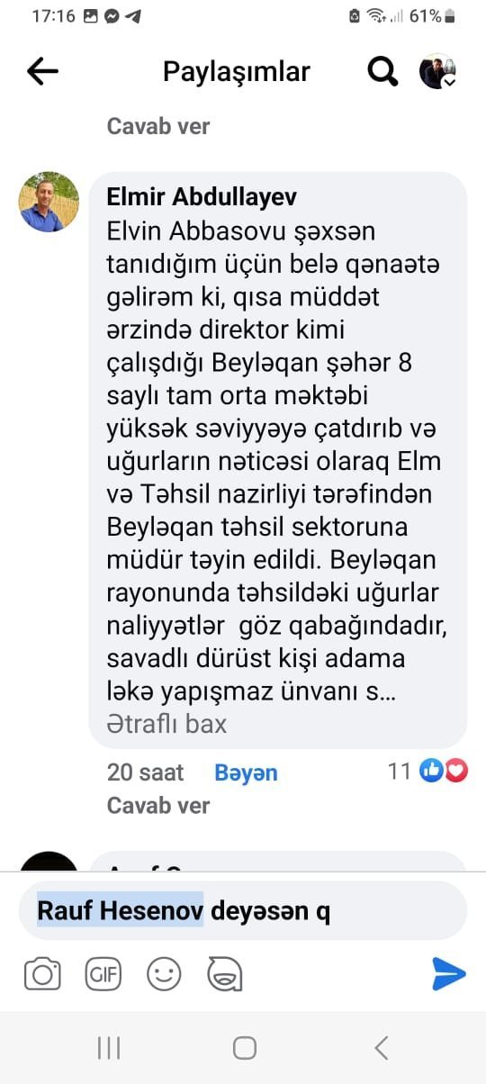 “Beyləqan təhsil sektoruna müdir təyin olunan Elvin Abbasov necə və hansı tələblərlə sektora müdir təyin edilib? Və yaxud Mil-Muğan Regional Təhsil İdarəsinin müdiri Rəşad Musayev diplomun legitimliyinə şübhə doğuran və bu əsasla da bir neçə il əvvəl öz ərizəsi ilə işlədiyi məktəbdən işdən azad olunan Elvin Abbasovun sənədlərini Təhsil Nazirliyindən necə keçirdib?