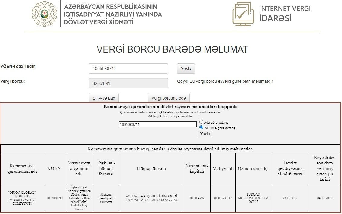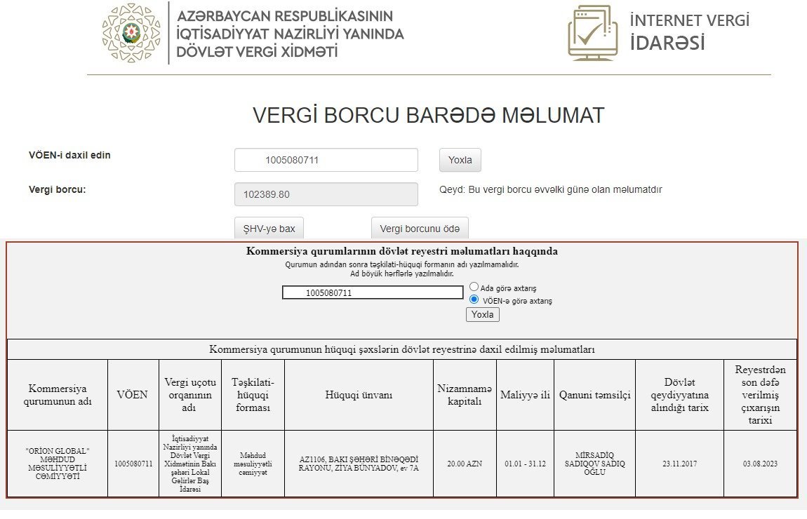 Buna baxmayaraq, hələ də şirkətin İqtisadiyyat Nazirliyi yanında Dövlət Vergi Xidmətinin Bakı şəhəri Lokal Gəlirlər Baş İdarəsinə 102 min 389 manat 80 qəpik vergi borcu qalır.