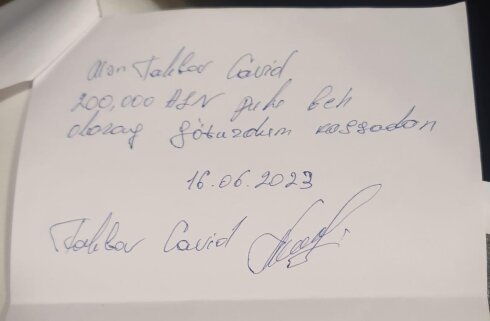 - Yox bir az səhv məlumatdır. 200 000 manat söhbəti var, amma mənim deyil. Bir yerim var idi, oranı bir qrup iş adamları alıb, orda ev tikmək istədilər. Oğlumu göndərdim getsin öyrənsin nə məsələdir? Oğlum gedəndə, kürəkənimdə onunla gedib və onlarla tanış olub, söhbətdən agah olub. Sonra mənim xəbərim olmadan, heç bir icazəsiz zadsız mənim adımdan gedib onlardan 200 000 beh alıb. Hətta qəbz belə verib. (Qəbzi bizə göstərdi) Rafail (ev tikmək üçün yeri almaq istəyən şəxs) mənə bunu deyəndə, mənim heç nədəın xəbərim olmadığını və heç kimdən 1 manatda almadığımı dedim. Nahaq pul verdiklərini və bunun sadəcə dəluduzluq olduğunu onların nəzərinə çatdırdım. Onlarda Cavidin PA-da işləyən bacsı oğlu Murad Tağıyev ilə dostdurlar və ona görə Cavidə inanıblar.