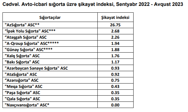 Son bir ildə (2022-ci ilin avqust ayından -2023-cü ilin sentyabr aylarına kimi) Azərbaycanda avtomobillərin icbari sığortası üzrə ən çox şikayət edilən şirkət "AzSığorta" (26.75) olub.