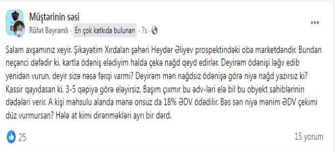 Daha sonra narazı vətəndaş yazır: "Bununla neçənci dəfədir ki, kartla ödəniş elədiyim halda çekə nağd qeyd edirlər. Deyirəm ödənişi ləğv edib yenidən vurun, deyir sizə nəsə fərqi varmı? Deyirəm mən nağdsız ödənişə görə niyə nağd yazırsız ki? Kassir qayıdasan ki, 3-5 qəpiyə görə eləyirsiz.