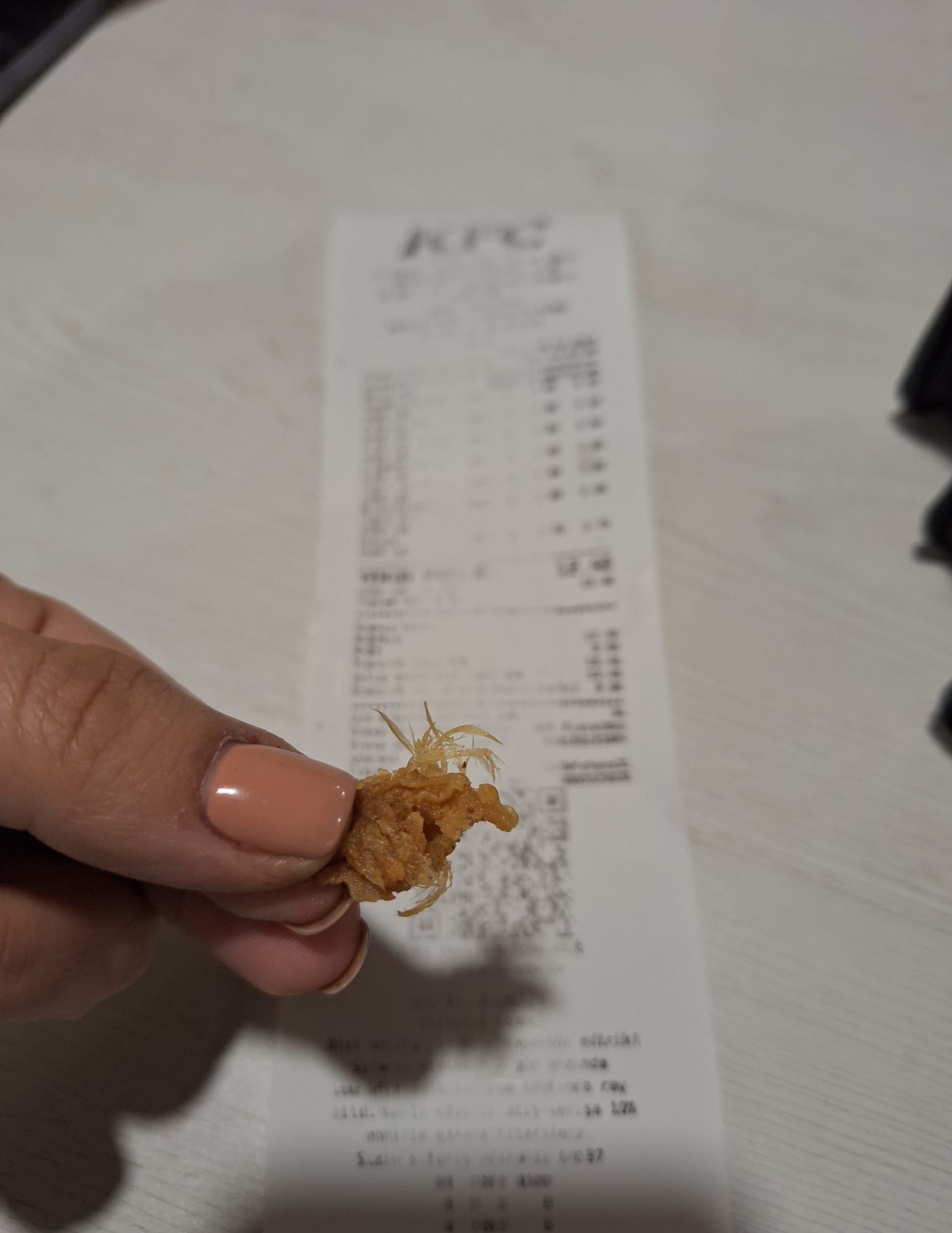 "Bu gün "KFC"də aldığımız toyuq budlarında belə bir mənzərə ilə rastlaşdıq". DİA.AZ bildirir ki, bunu "Müştəriyəm Şikayətim Var" sosial qrupundakı paylaşımında Afa Orucova adlı istifadəçi bildirir. Narazı vətəndaş iddia edir ki, aldığı mhsulun üzərində tük topası aşkarlayıb. Yəni yediyi məhsul elə tüklü-tüklü bişirilərək ona verilib.