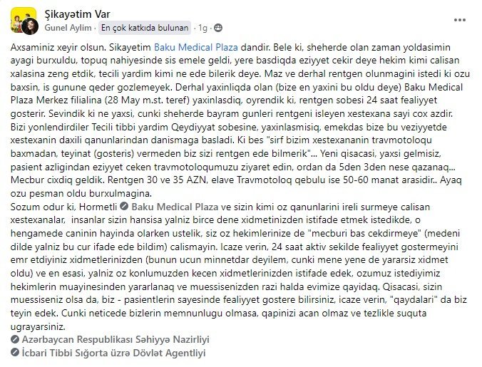 "Sikayetim Baku Medical Plaza dandir. Bele ki, sheherde olan zaman yoldasimin ayagi burxuldu, topuq nahiyesinde sis emele geldi, yere basdiqda eziyyet cekir deye hekim kimi calisan xalasina zeng etdik, tecili yardim kimi ne ede bilerik deye. Maz ve derhal rentgen olunmagini istedi ki ozu baxsin, is gunune qeder gozlemeyek. Derhal yaxinliqda olan (bize en yaxini bu oldu deye) Baku Medical Plaza Merkez filialina (28 May m.st. teref) yaxinlasdiq, oyrendik ki, rentgen sobesi 24 saat fealiyyet gosterir. Sevindik ki ne yaxsi, cunki sheherde bayram gunleri rentgeni isleyen xestexana sayi cox azdir.