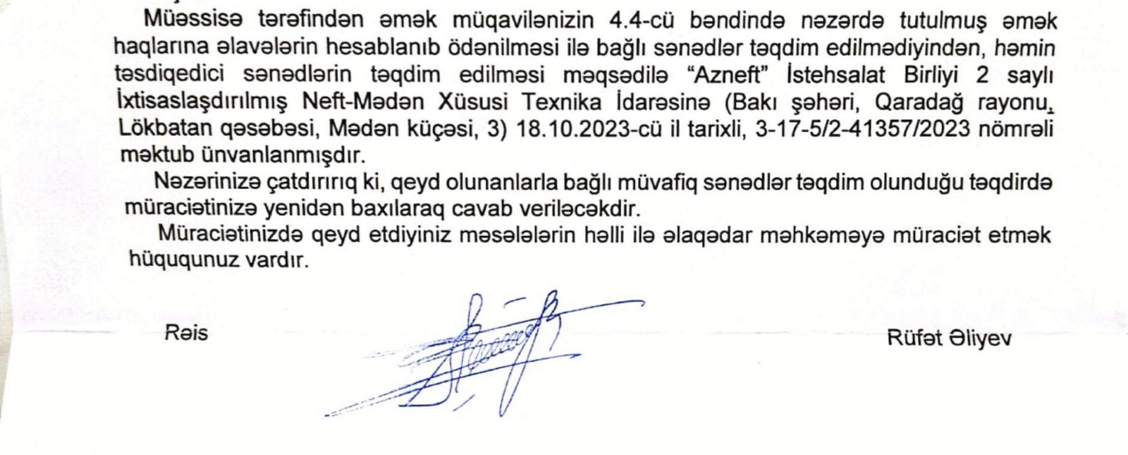 Əmək Müfəttişliyinin məktubunun son hissəsi əlavədə..."