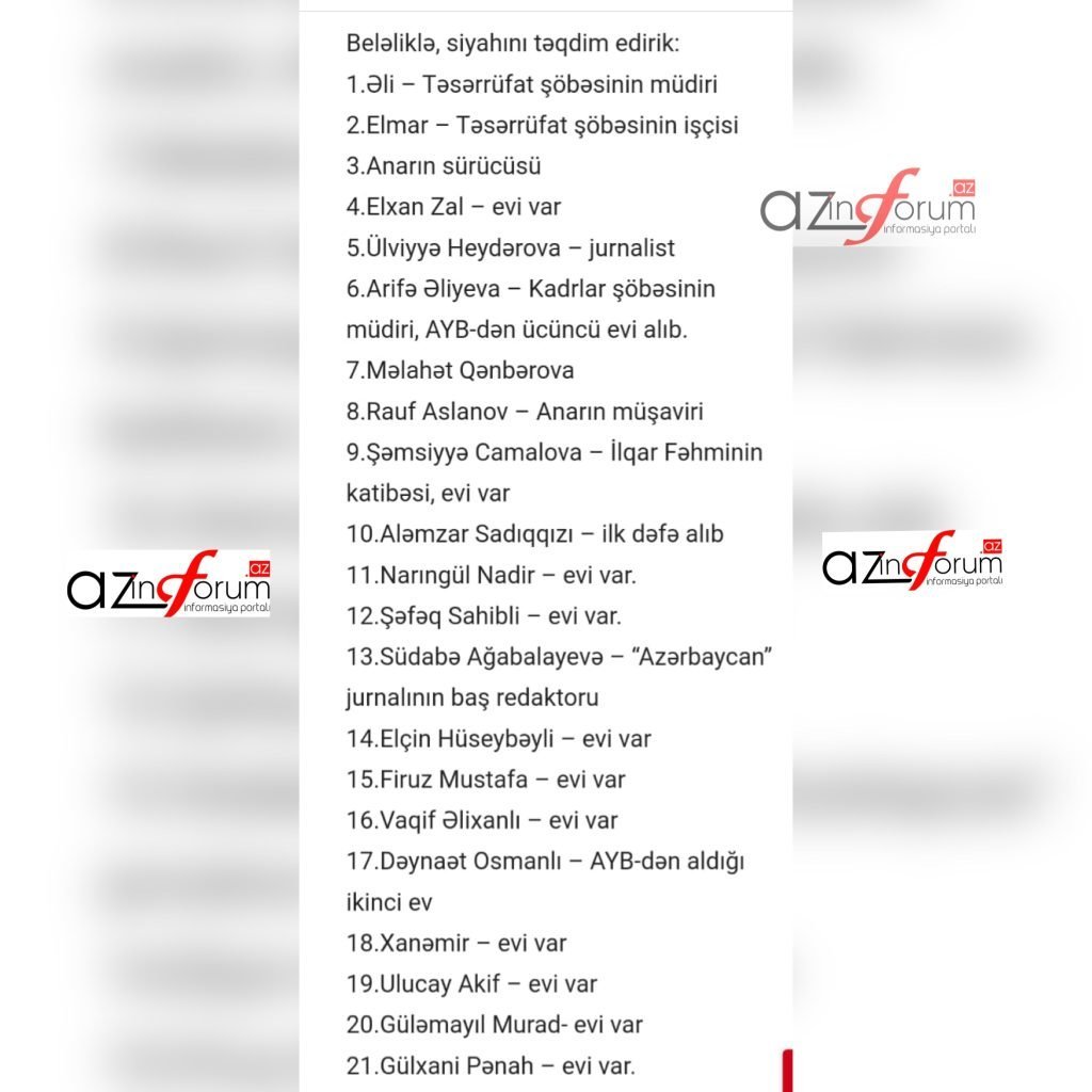Qurumun daxilindən bizə kimlərin mənzil əldə etdikləri ilə bağlı bir siyahı ötürülüb. Həmin siyahını da izləyicilərin diqqətinə çatdırırıq. Siyahıda adları keçən hər bir şəxs bizə mövqeyini açıqlaya, mənzil alıb-almadığı barədə məlumat verə bilər.