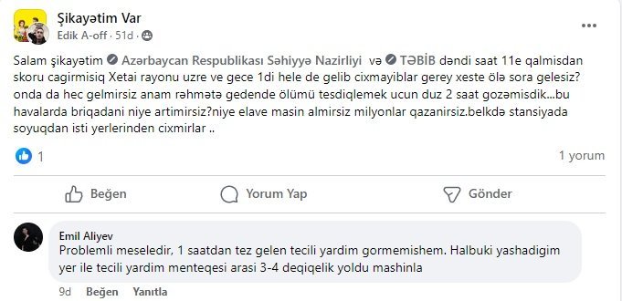 "Şikayətim Azərbaycan Respublikası Səhiyyə Nazirliyi və TƏBİB-dəndir. Saat 11-ə qalmışdan Təcili Tibbi Yardım çağırmışıq. Xətai rayonu üzrə... Və gecə 1 olub... hələ də gəlib çıxmayıblar...
