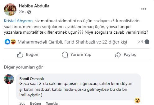 " "Kristal Abşeron", siz mətbuat xidmətini nə üçün saxlayırsız? Jurnalistlərin suallarını, medianın sorğularını cavablandırmaq üçün, yoxsa tənqid yazanlara müxtəlif təkliflər etmək üçün? Niyə sorğulara cavab vermirsiniz?" Bildirək ki, bu eirazla jurnalist Həbibə Abdulla çıxış edib.