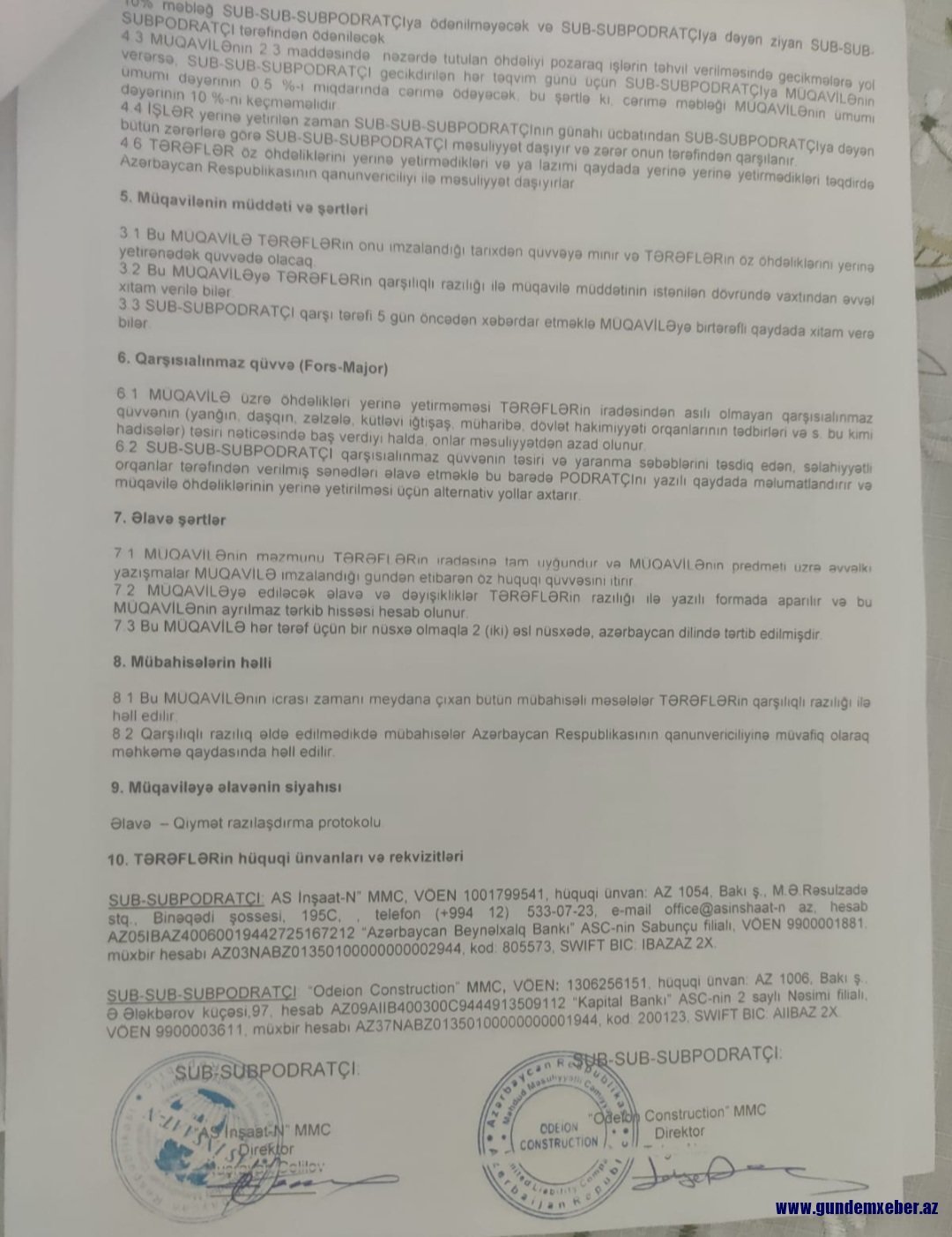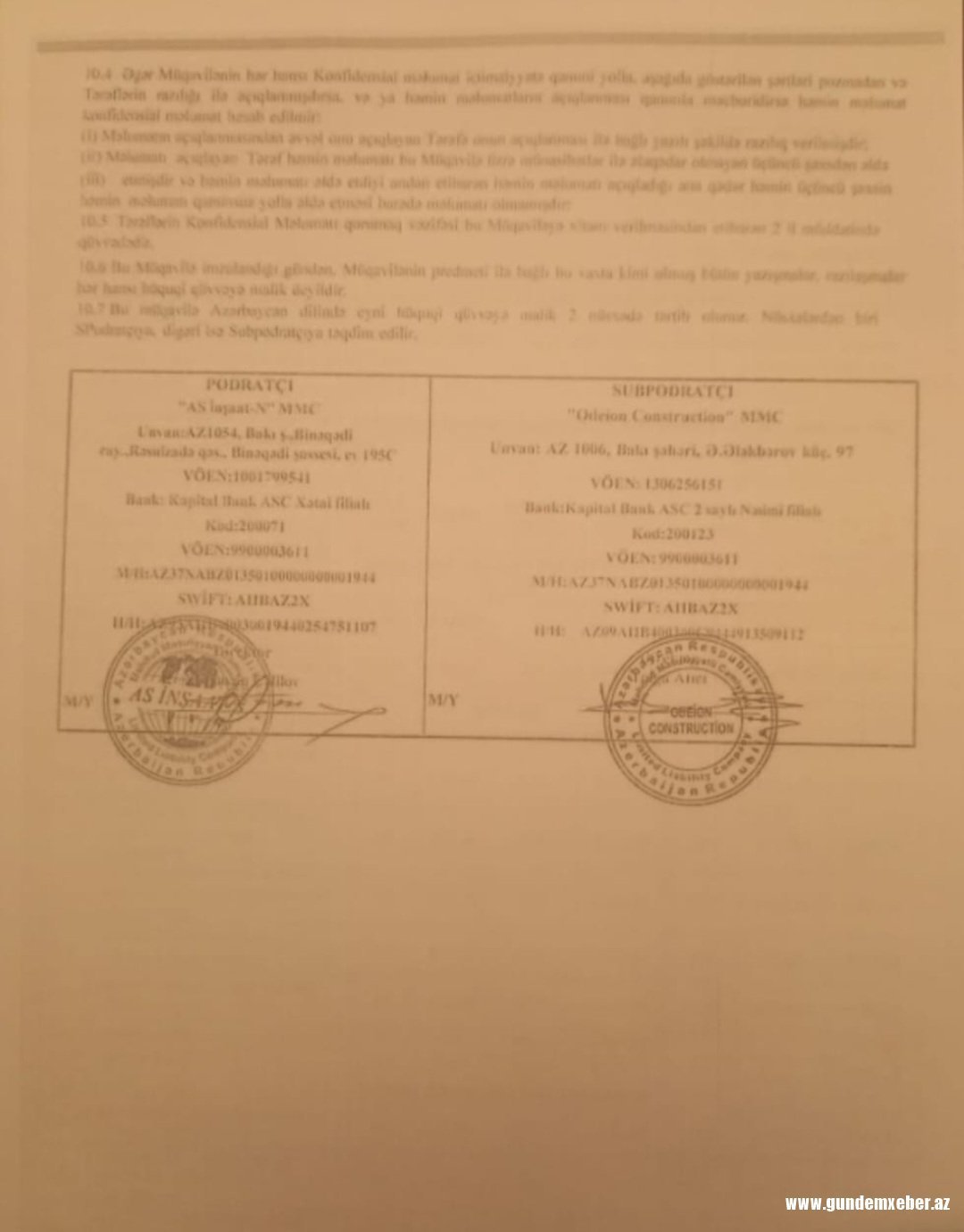 Artıq podratçı şirkətlər rəhbərlik etdiyim “ODEİON” şirkəti ilə bağlı Kommersiya Məhkəməsinə müraciət ediblər. Ötən altı ay ərzində “AS İNŞAAT-N”-ın rəhbər şəxsləri keçirdikləri iclaslarda bizə və podratçı şirkətlərə olan borc məsələlərini müzakirə etsələr də, son anda onlar ödəməli olduqları borcu ödəməkdən imtina edirlər, hətta forma-2 də təsdiq etmirlər. Belə bir səbəblər üzündəndir ki, bu gün “ODEİON” şirkəti ilə vergi orqanları arasında hədsiz narazılıqlar da əmələ gəlib. Məsələnin daha çox diqqəti cəlb edən tərəfi odur ki, bu gün “AS İNŞAAT-N” şirkətində direktor vəzifəsini daşıyan Babək Nuşirəvani qeyd olunan borcu ödəməkdən imtina edir. Bu şəxs bəhanə olaraq onu qeyd edir ki, “Müqavilə sənədi şirkətin əvvəlki rəhbəri Nişirəvan Cəlilovla bağlanıb. Ona görə də 383447 manat borcu Nişirəvan Cəlilovdan almalısınız” deyib, bu yolla ortaya minbir bəhanələr gətirir.