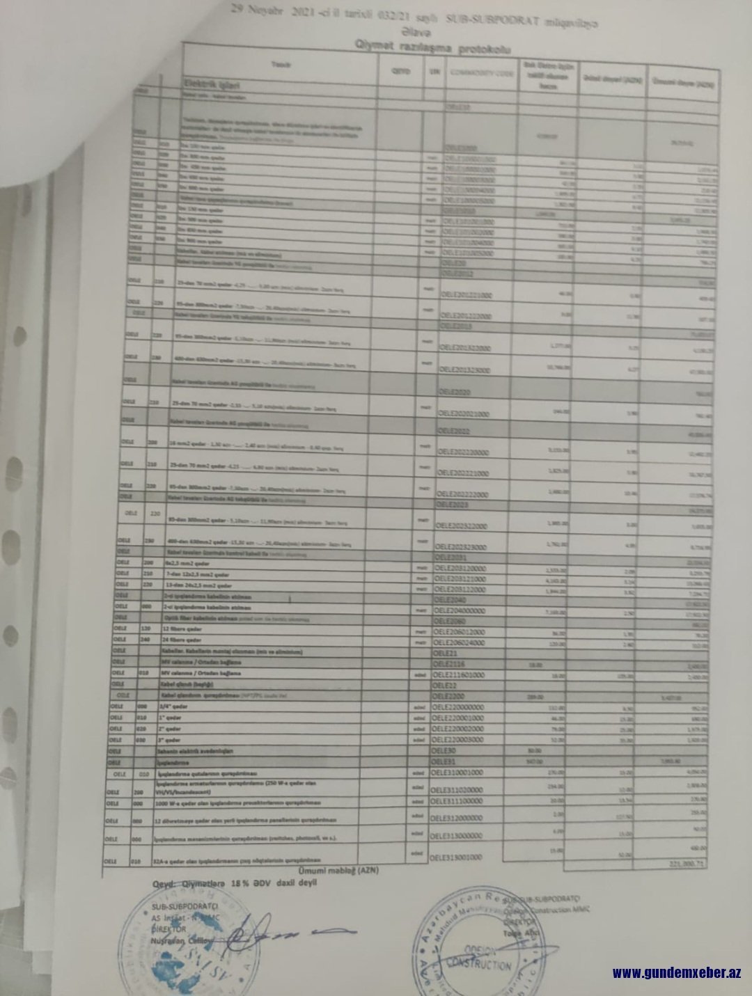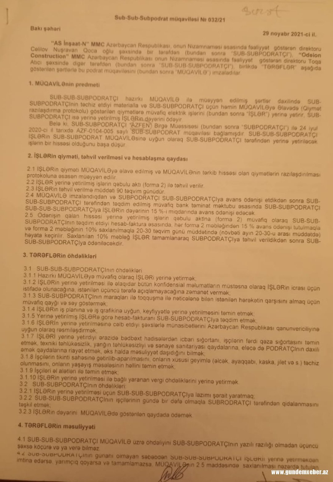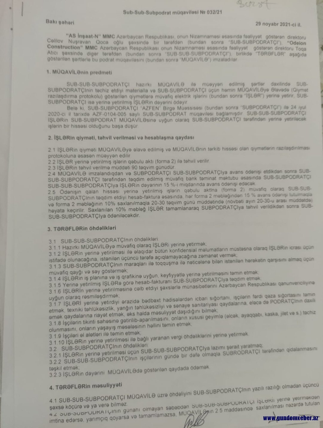 Bundan əlavə, 29 noyabr 2021-ci il tarixdə “AS İNŞAAT-N” şirkəti ilə 03221 saylı növbəti müqavilə sənədi bağladıq. Bu müqavilə sənədi üzrə rəhbərlik etdiyim “ODEİON” şirkəti Heydər Əliyev adına Neft Emalı Zavodunda elektrik işlərinin çəkilişini həyata keçirdi və görülən işlərin qarşılığında “AS İNŞAAT-N”-ın “ODEİON” şirkətinə 212447 manat məbləğində borcu əmələ gəldi. Qeyd edim ki, bütün bunlar elektron qaimələrlə vurulub və qarşı tərəf də qaimələri təsdiq edib. Buna baxmayaraq, “AS İNŞAAT-N”-ın rəhbərliyi bu gün də bizə olan borclarını ödəmir və belə bir səbəbdən də, podratçı şirkətlərlə aramızda olan münasibətlər pozulmağa başlayıb.