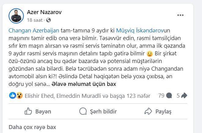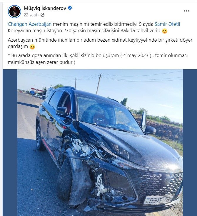 “Changan Azerbaijan tam-tamına 9 aydır ki Müşviq İskəndərovun maşınını təmir edib ona verə bilmir. Təsəvvür edin, rəsmi təmsilçidən sıfır km maşın alırsan və rəsmi servis təminatın olur, amma ilk qəzanda 9 aydır rəsmi servis maşının detalını tapıb gətirə bilmir. Bir şirkət özü-özünü ancaq bu qədər bazarda və potensial müştərilərin gözündən sala bilərdi”.