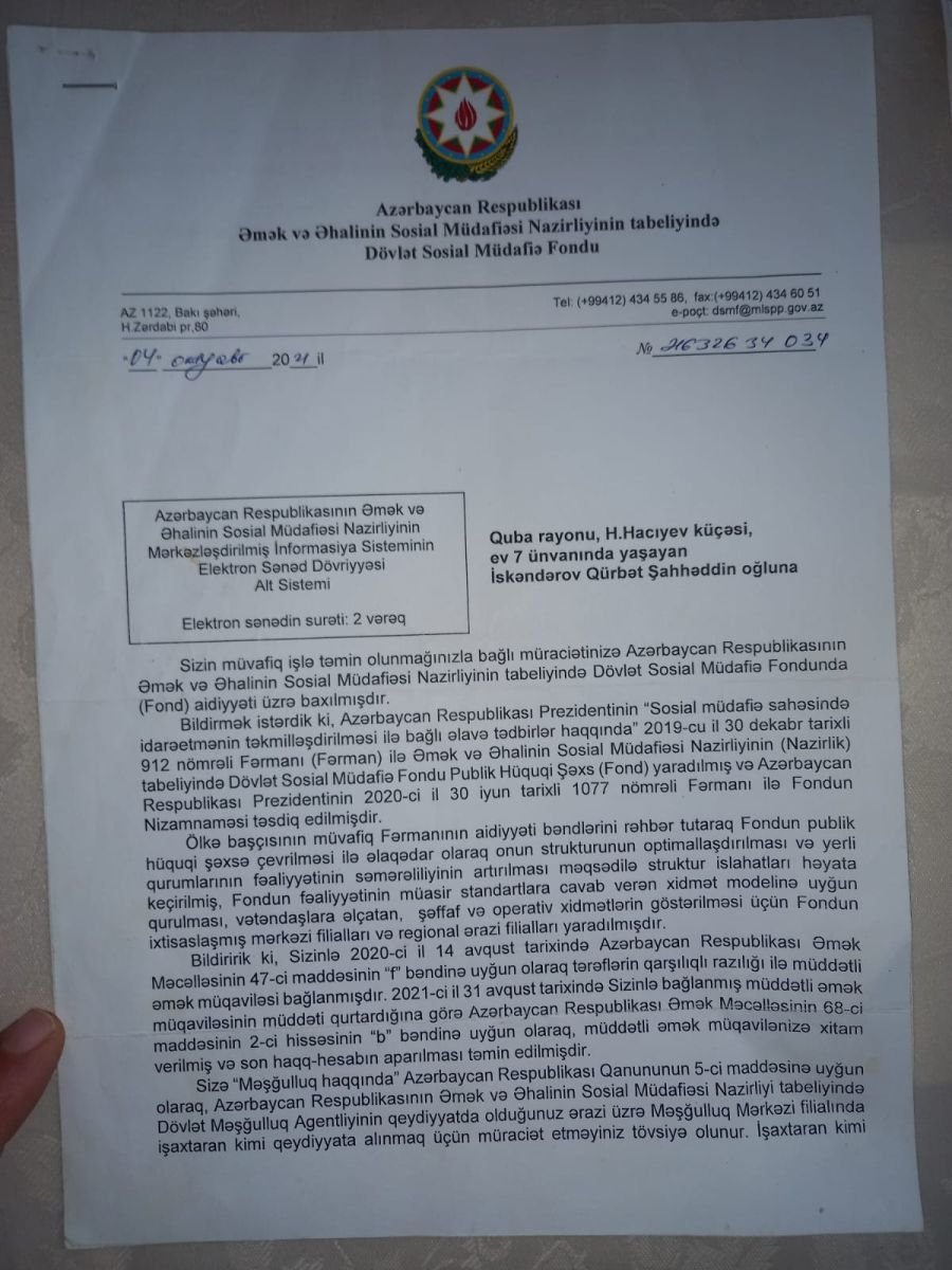 Məlumat üçün bildirim ki, 18 il Quba DSMF-də müxtəlif vəzifələrdə çalışmışam. 2020-ci ildə Əmək və Əhalinin Sosial Müdafiəsi Nazirliyinin tərkibində “Dövlət Sosial Müdafiə Fondu” publik hüquqi şəxs yaradılmışdır. İşlədiyim dövrdə heç bir töhmətim olmamışdır. Həmişə dövlətimizə və dövlətçiliyimizə xidmət etmişəm. Lakin 2021-ci ilin avqust ayında işdən azad olunmuşam. Səbəb isə publik hüquqi şəxslə 3 aylıq əmək müqaviləmin bitməsidir. Budurmu, dövlət qulluqçusuna qoyulan hörmət?!