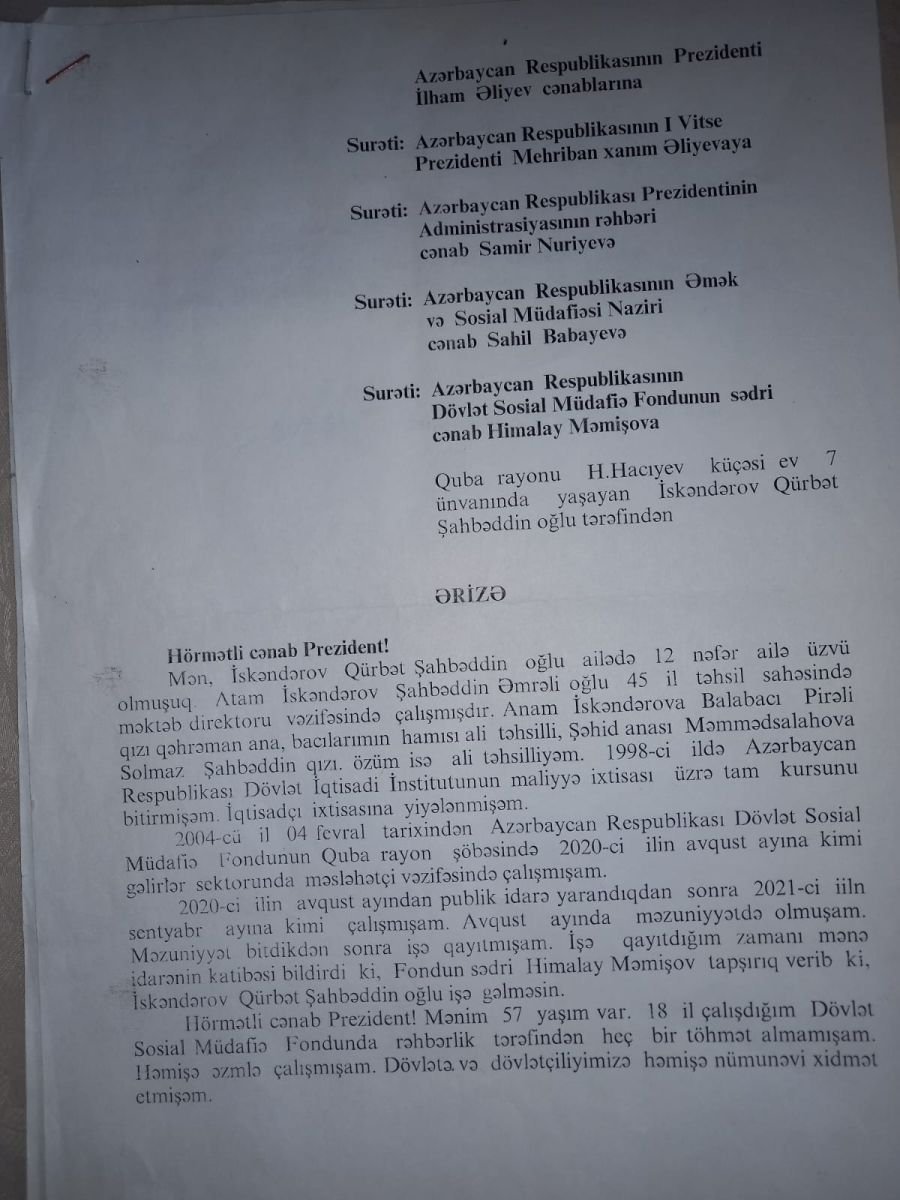 “Mən, İskəndərov Qürbət Şahbəddin oğlu, yazaraq sizdən xahiş edirəm ki, problemimi işıqlandırasınız.