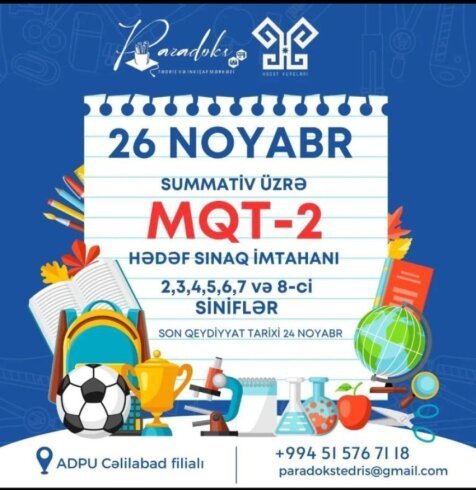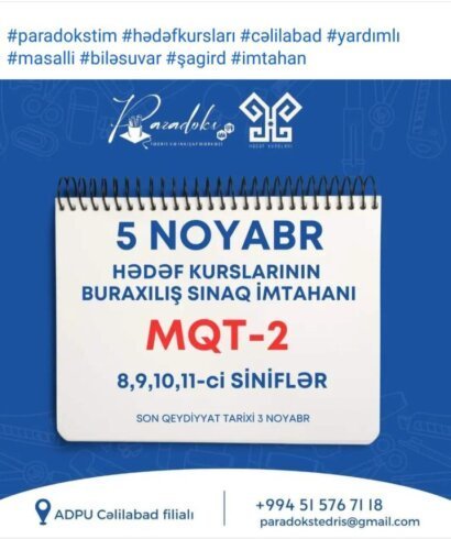 1) Hədəf kurslarının 2,3,4,5,6,7,8,9,10 və 11-ci sinif şagirdləri üçün BLOK sınaq imtahanlarının ADPU Cəlilabad filialının auditoriyalarında ödənişli təşkili;