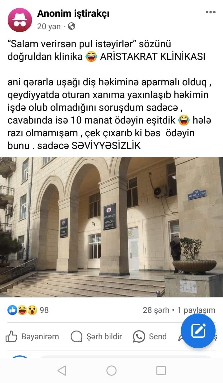 “Aristokrat” klinikasının qeydiyyat şöbəsində həkimin iş rejimini soruşan kimi ödəniş tələb olunurmuş. Tribunainfo.az qeyd edir ki, sosial mediada bu məsələ gündəmə gətirilib və gülüş doğurub. “Ani qərarla uşağı diş həkiminə aparmalı olduq, qeydiyyatda oturan xanıma yaxınlaşıb həkimin işdə olub- olmadığını soruşdum sadəcə, cavabında isə 10 manat ödəyin eşitdik. Hələ razı olmamışam, qəbz çıxarıb ki, bəs ödəyin bunu… Sadəcə səviyyəsizlikdir”.