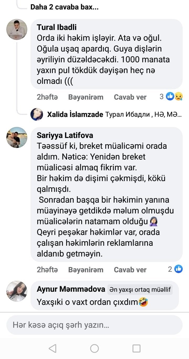 Səriyyə Lətifova adlı sosial media istifadəçisi də şikayət edib: “Təəssüf ki, breket müalicəmi orada aldım. Nəticə: Yenidən breket müalicəsi almaq fikrim var.