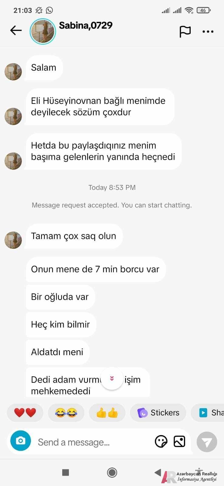 Sabina xanım bildirir ki, onunla əvvəl evlənmiş Aygün xanım guya ona türk vətəndaşı ilə xəyanət etdiyinə görə onu atmışdır. Sabina xanım bildirir ki ondan, atasının verdiyi 7000 manat pulu Əli, maşınla adam vurduğunu görə kiməsə verəcəyi adı altında Sabinadan pulu götürmüşdür. İndi qadın şikayətçi olaraq, Aygün xanımın mikrafonumuza ötən ayda verdiyi müsahibəni 13 fevrala söz verdiyi tarixdə pulu qaytarmayacagi təqdirdə eyni onkoloji müsahibə verəcəyini Əli Hüseynova bildirməklə xəbərdarlıq etmiş, əks halda terapiya müalicəsi işinin apardığı Yasamal hospitalına cəkilislə gələcəyini bildirmişdir.