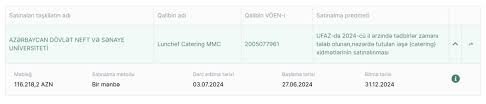 Azərbaycan Dövlət Neft və Sənaye Universiteti “UFAZ-da 2024-cü il ərzində tədbirlər zamanı tələb olunan, nəzərdə tutulan iaşə (catering) xidmətlərinin satınalınması” tenderinin nəticələrini elan edib. Satınalma portalının məlumatına görə, tenderin qalibi “Lunchef Catering” MMC şirkəti (VÖEN: 2005077961) olub. Qalib şirkətlə 116 218 manat məbləğində müqavilə imzalanıb.