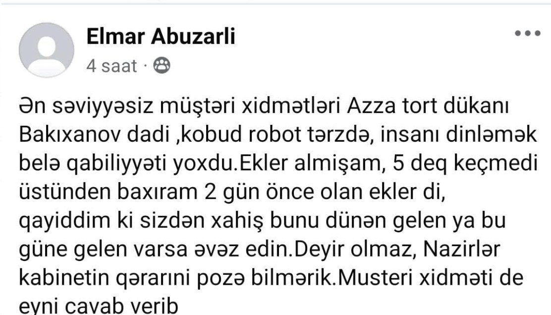 “Ən səviyyəsiz müştəri xidmətləri “Azza” tort dükanı Bakıxanovdadır. Operator kobud robot tərzdə danışır, insanı dinləmək belə qabiliyyəti yoxdu. Ekler almışam, 5 dəqiqə keçmedi üstünden, baxıram ki, 2 gün önce olan eklerdi, dedim, sizdən xahiş edirəm, dünın gələn varsa, onunla dəyişin. Deyir olmaz, Nazirlər Kabinetinim qərarını poza bilmərik. Müstəri Xidməti də eyni cavab verdi.