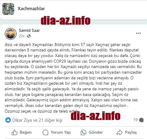 "Əziz və dəyərli Xaçmazlılar. Bildiyiniz kimi 57 saylı Xaçmaz şəhər seçki dairəsindən 8 namizəd qeydə alınıb. Filankəs təyin edilib, filankəs deputat olacaq deyə bir şey yoxdur. Xalq öz namizədini özü seçəcək bu dəfə. Çünki qarşıda dünya əhəmiyyətli COP29 layihəsi var. Dünyanın gözü bizdə olacaq bu seçkilərdə. O üzdən hər bir Xaçmazlı seçdiyi namizədə səs verməlidir. Bu həqiqətən mühim məsələdir. Bu günə kimi ancaq bir partiyadan namizədlər olub bizdə. Eyni partiyanın adamları da seçilib bizi veclərinə almayıb. O üzdən biz Xaçmazlıların gedəcək bir yeri olmayıb. İndi hər şey öz əlimizdədir. Ya seçib qalib gələcəyik. Ya da yenə də inamsız yanaşıb passiv olub, hər şeyə biganə yanaşaraq kənardan baxa qalacağıq. Seçim öz əlimizdədir. Gələcəyimiz üçün addım atmalıyıq. Xalqın səsi olan birinə səs verməliyik. Əsas odur kənardan gələn deyil öz Xaçmazlımız seçilsin . Özümüz seçək və özümüz də tələb edək..."