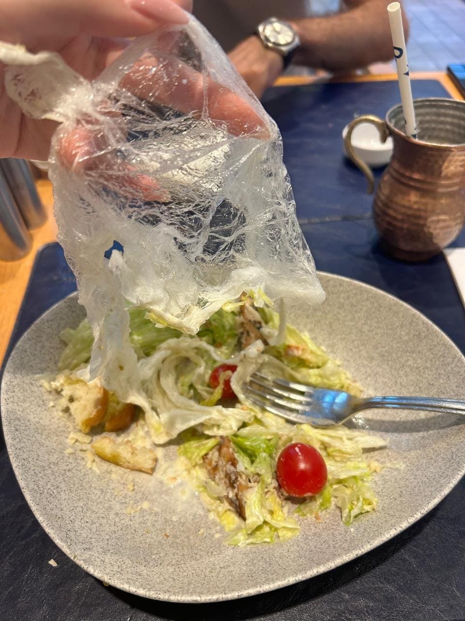 Narazı vətəndaş daha sonra yazır: "Bu gün (dünən nəzərdə tutulur -red.) "Gənclik Mall"da yerləşən "Mado" restoranında yemək üçün əyləşdik. Gətirdikləri sezar salatından bir az yedikdən sonra bıçaqla bölməyə çalışdığımız qidanın mayonezli kələm yox, salatın içinə qarışıb ərimiş böyük bir sellofan olduğunu gördük. Yeməkdən tük çıxmağını başa düşərəm, amma daha "çanta" çıxmasın da...