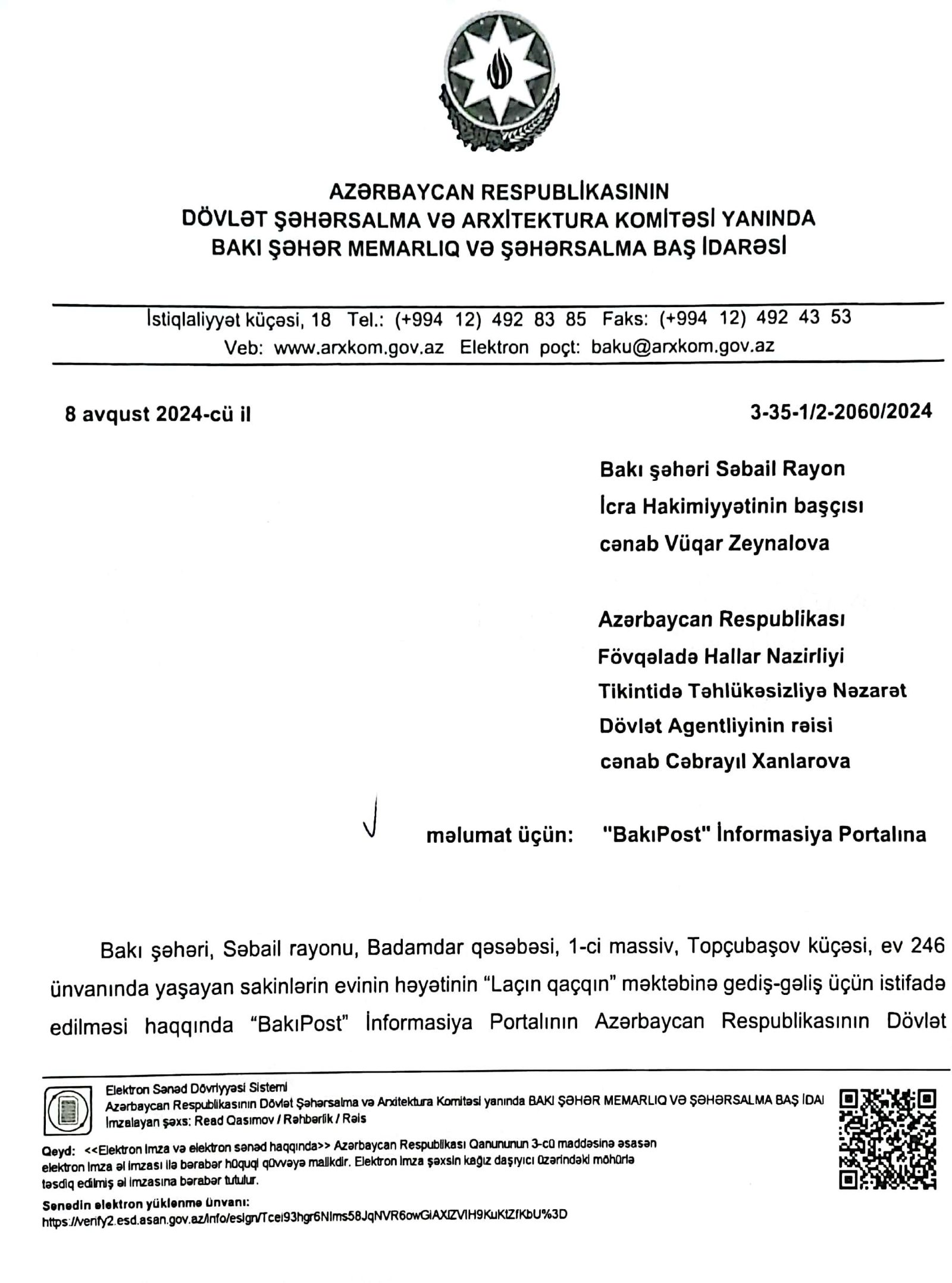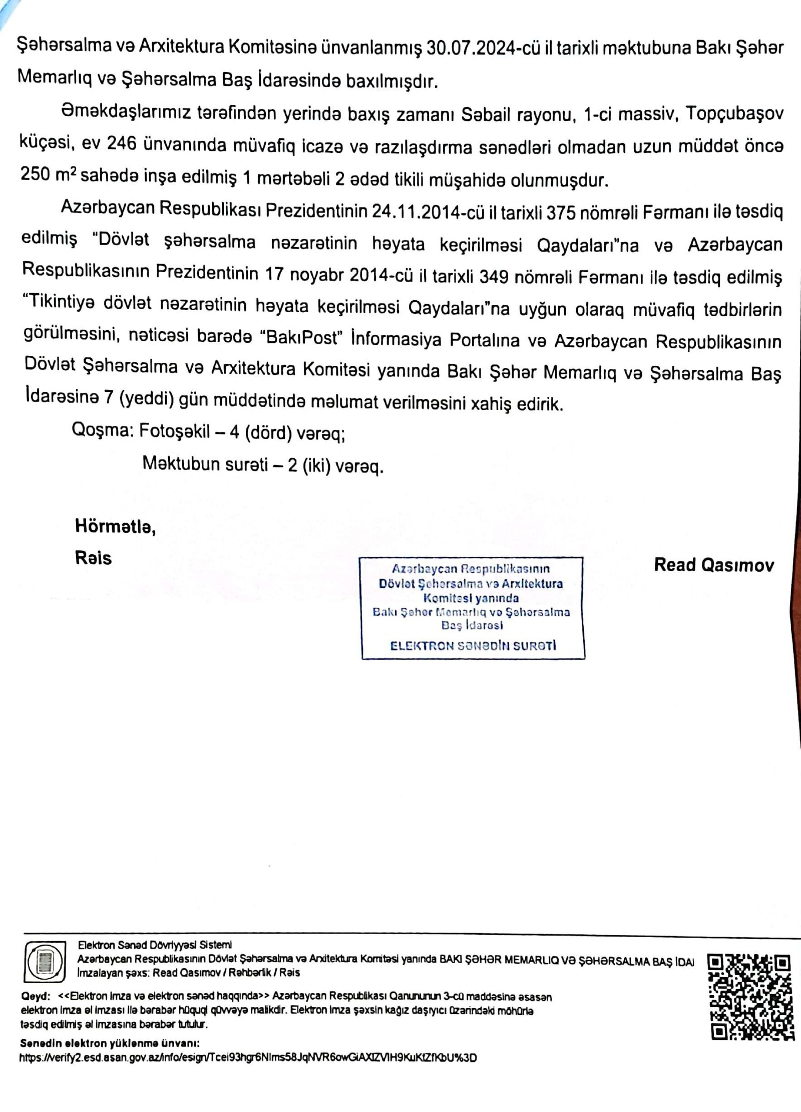 Sorğuya cavabdan o da aydın olur ki, Dövlət Şəhərsalma və Arxitektura Komitəsi yanında Bakı Şəhər Memarlıq və Şəhərsalma Baş İdarəsinin rəisi Read Qasımov məsələ ilə bağlı Səbail rayon İcra Hakimiyyətinin başçısı Vüqar Zeynalov və Fövqəladə Hallar Nazirliyi Tikintidə Təhlükəsizliyə Nəzarət Dövlət Agentliyinin rəisi Cəbrayıl Xanlarova müraciət edərək, Azərbaycan Respublikası Prezidentinin 24.11.2014-cü il tarixli 375 nömrəli Fərmanı ilə təsdiq edilmiş "Dövlət şəhərsalma nəzarətinin həyata keçirilməsi Qaydaları"na və Azərbaycan Respublikası Prezidentinin 17 noyabr 2014-cü il tarixli 349 nömrəli Fərmanı ilə təsdiq edilmiş "Tikintiyə dövlət nəzarətinin həyata keçirilməsi Qaydaları"na uyğun olaraq, müvafiq tədbirlərin görülməsini xahiş edib.