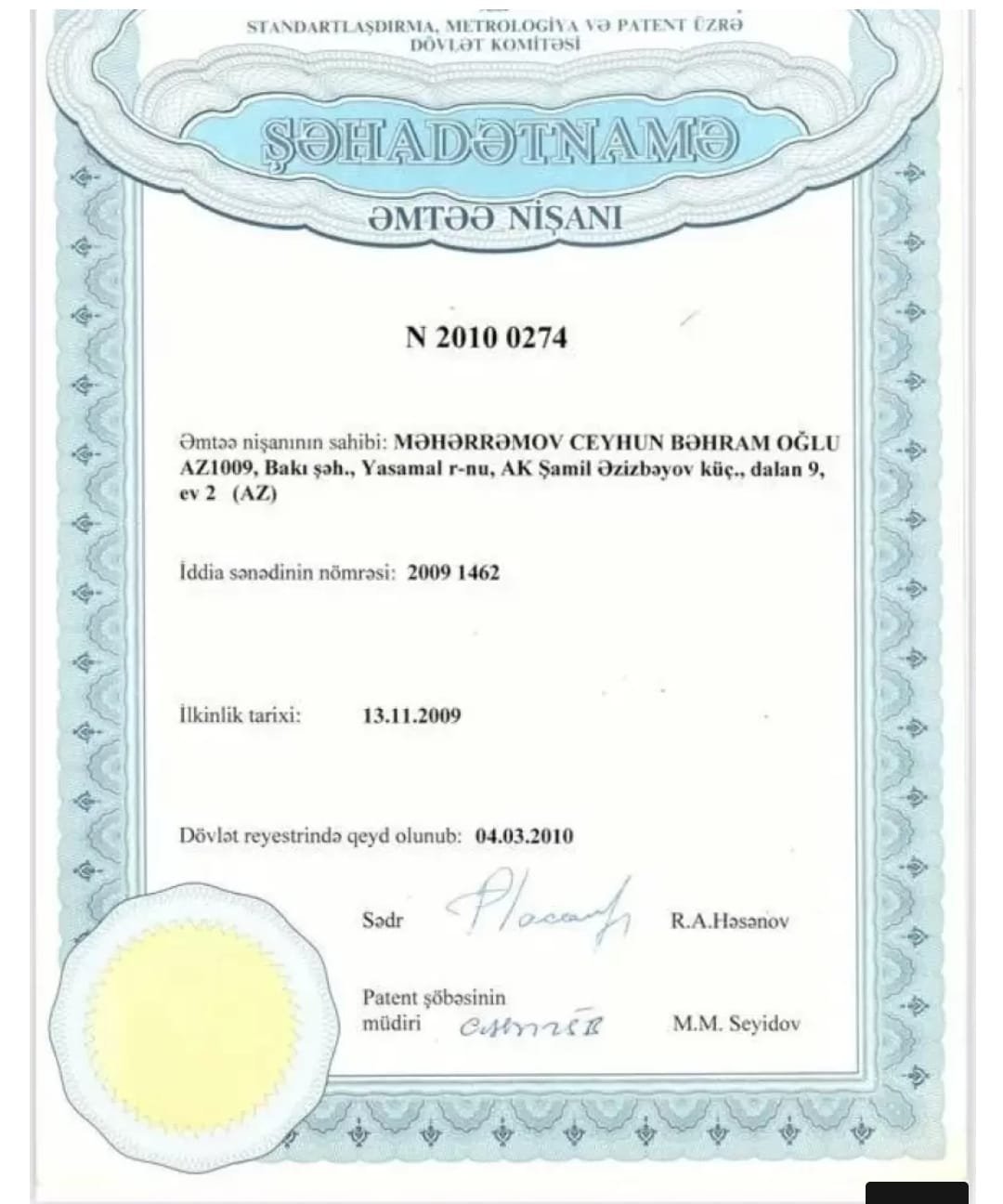 Buna qədər də N.Sadıqovun Aqil Babayevə qarşı xain planları olub. Məsələn, Standartlaşdırma, Metrologiya və Patent üzrə Dövlət Komitəsi tərəfindən Ceyhun Məhərrəmova 4 mart 2010-cu il tarixli (reyestr nömrəsi 2010 0274) ŞAURMA №1 nömrəli əmtəə nişanına hüququnun təsbit edilmiş həmin sertifikat verilmişdir. Söhbətin dövlət qurumu tərəfindən təsdiq edilmiş rəsmi sənəddən getdiyini nəzərə alsaq, Məhərrəmovun şəxsi razılığı olmadan kiminsə bu sənədə dəyişiklik edə biləcəyini heç ağlına belə gətirməyib. Əmtəə nişanı hüququ Natiq Sadıqovun xalasıoğlu Teymur İmaməliyevin adına qeydiyyatdan keçib.Eyni zamanda, həm buraxılış tarixi, həm də reyestr nömrəsi C.Məhərrəmovun hüquqları ilə eyni idi. Belə çıxır ki, eyni sənəd eyni vaxtda iki müxtəlif hüquqi şəxsə verilib. Amma bu baş verə bilməz, elə deyilmi? Sonra mən bu hekayənin dolaşıqlığını açmağa başladım və nəticədə İmamverdiyevin başqasının əmtəə nişanının mənimsənilməsi ilə bağlı sövdələşməsinə nail olan fırıldaqçılıq və saxtakarlığın mürəkkəb texnologiyasını üzə çıxardım. Sənədi notarial qaydada təsdiq etmədən həqiqi mülkiyyətçi Ceyhun Məhərrəmovun ona hüquqların könüllü keçməsi haqqında imzasını saxtalaşdırıb.