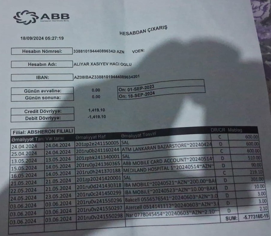 “Mən, Xasiyev Əliyar Hacı oğlu, yazaraq bildirirəm ki, 15 mart 2024-cü il tarixində “UPSİLON” şirkətində işə başlamışdım. Bu zaman ikilikdə bağlanan müqaviləni görməmişəm. Mənə 1800 manat əmək haqqı, 250 manat öz maşınıma görə xərc, yanacaqla təminat və ezamiyyət xərci söz verilmişdi.
