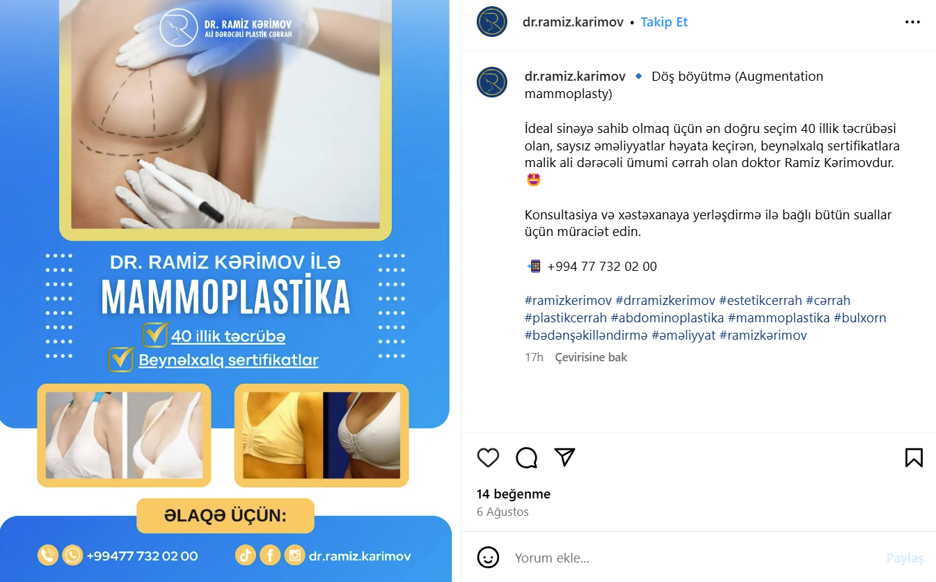 Belə ki, C.V. "Reo Med"in həkimi Ramiz Kərimov tərəfindən mamoplastika əməliyyatı edildiyini, lakin əməliyyatın uğurlu keçmədiyi və sağlamlığında fəsadlar yarandığı barədə hüquq-mühafizə orqanlarına şikayət edib.