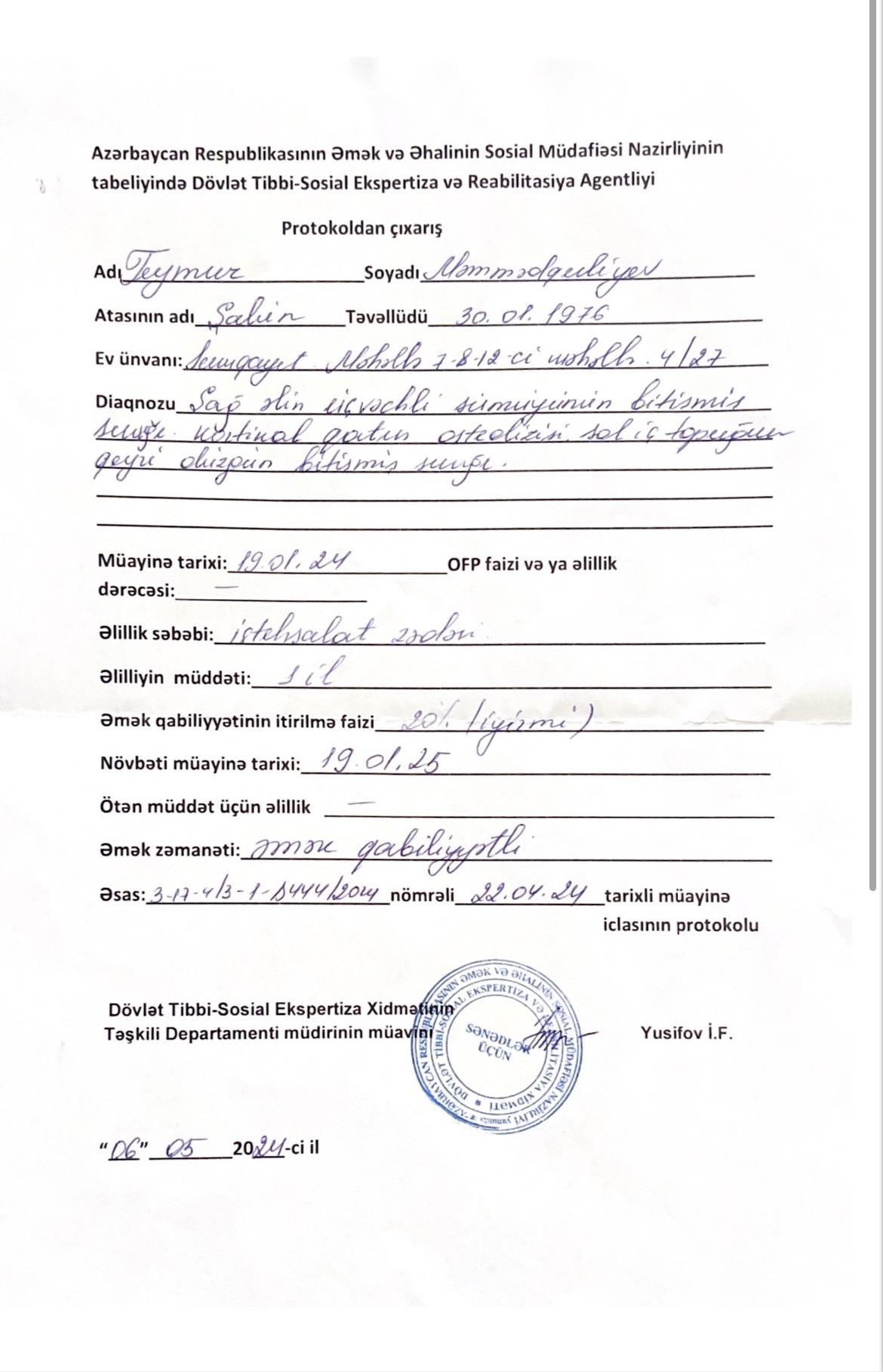 Ötən ilin mayın 16-dan işə çıxmağa başladım. Şirkət mənə dedi ki, zədələnmiş xəstə adamsan, sənin üçün burada iş yoxdur, ərizə yaz, çıx. Mən rəis idim və fiziki pozğunluğum sadəcə 20%-dir, amma işləməyə icazə vermədilər. Halbuki mən bu şirkətə görə şikəst olmuşam. Dedilər ki, müqaviləni yeniləyək 500 manat əməkhaqqı ilə işlə. Təbii ki, bununla razılaşmadım və məni oktyabrın 1-i 2024-cü il tarixində 67 C maddəsi ilə işdən azad etdilər”.