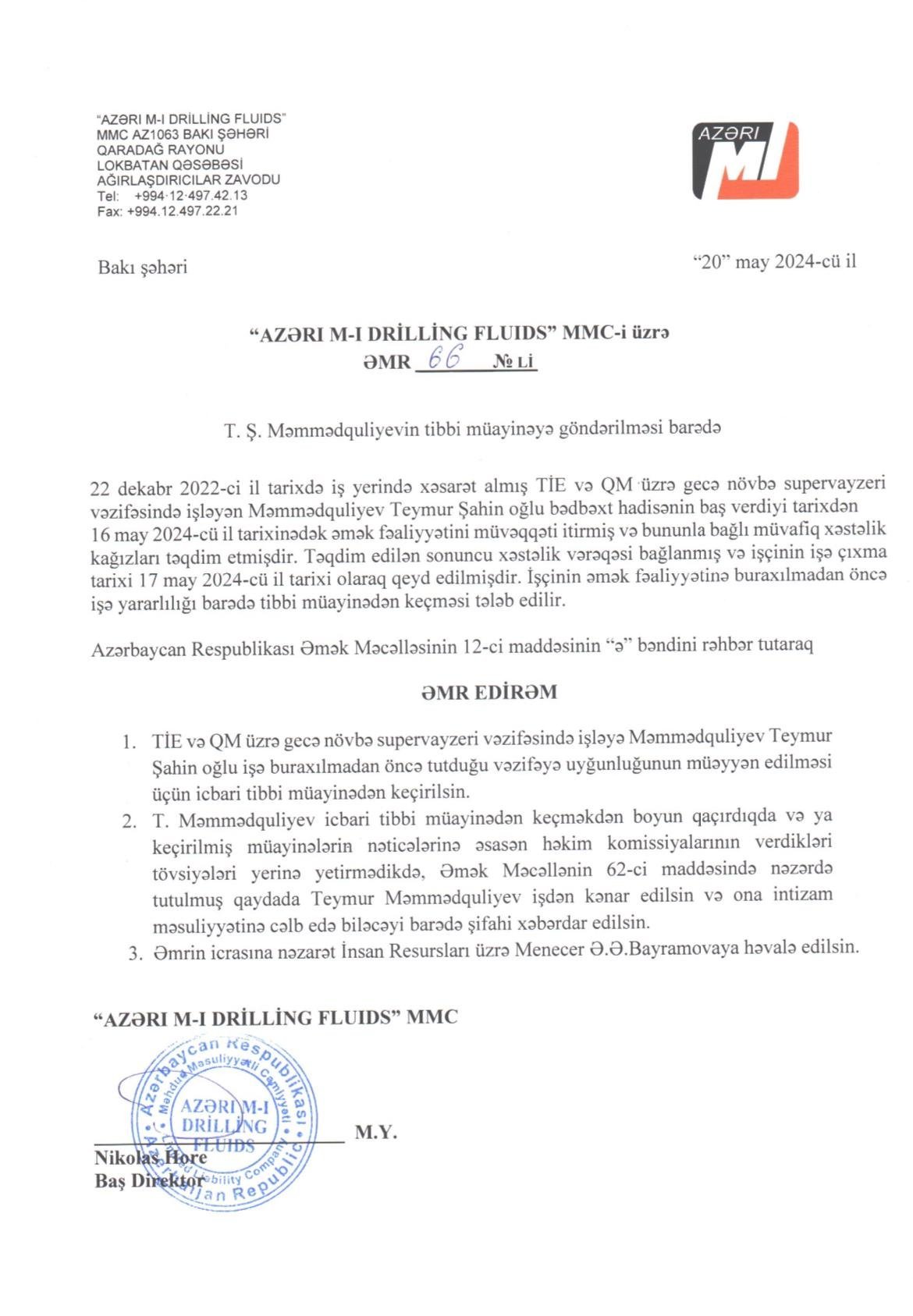 “20 ildir “Azeri MI Drilling Fluids Ltd” neft şirkətində işləyirəm. İstehsalat zamanı xəsarət alsam da, şirkət kompensasiyamı ödəmir və üstəlik, məni işdən azad edib”.