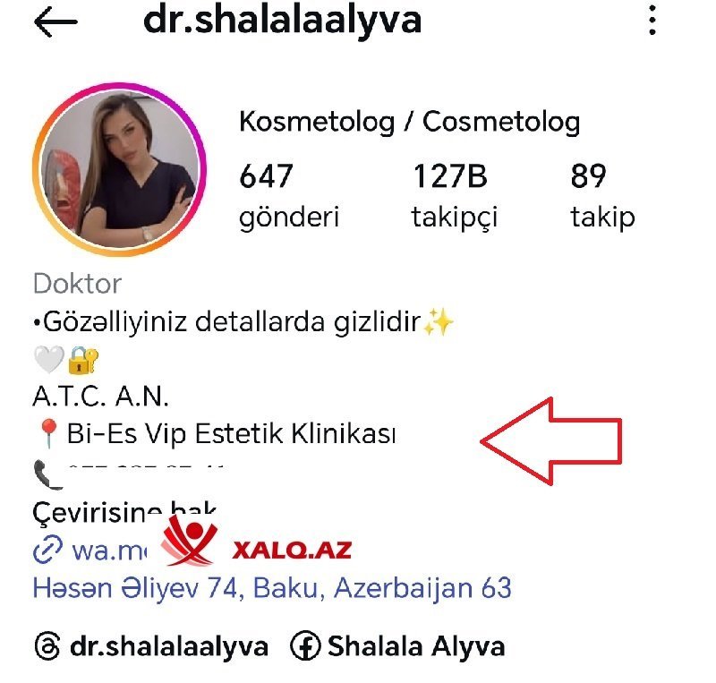 Tibbi təhsili olmadan, lisenziyasız və sertifakatsız “Bi-Es Vip estetik mərkezində fəaliyyət göstərən sosial şəbəkədə kosmetoloq “shalalaalyeva” adı ilə reklam edən Şəlalə Əliyevadır.