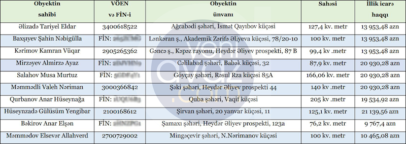 İmzalanan icarə müqavilələrində diqqət çəkən məqamlardan biri odur ki, fərqli rayonlarda fərqli sahələri olan obyektlər üçün eyni icarə haqqı ödəniləcək. Məsələn, Cəlilabad şəhərindəki 87,9 kv. metr sahəsi olan obyekt üçün də, Şəki şəhərindəki 140 kv. metr sahəsi olan obyekt üçün də eyni məbləğ – 20 min 930 manat 28 qəpik ödəniləcək.